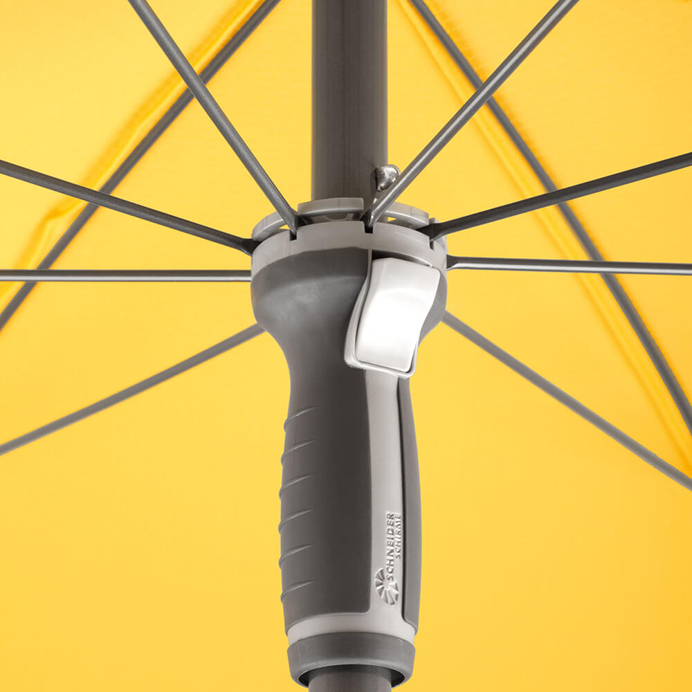 Unsere Sonnenschirme überzeugen durch ihre hohe Robustheit und Stabilität. Der grosse Sonnenschirm ist aus 100% Polyester mit 220g/m² gefertigt. Das Material ist verrottungsfest, schmutzabweisend, wasserabstossend imprägniert und lichtecht. Das Gestell sowie die Gelenke bestehen aus pulverbeschichtetem, korrosionsbeständigem Aluminium in Anthrazit. Der Mast hat einen Durchmesser von 27/30 mm. Über einen Schieber mit Soft-Grip lässt sich der Schirm einfach öffnen und schliessen. Dank einem Metallknicker kann der Schirm geneigt und mittels Drehfeststeller in der Höhe verstellt werden. Die Umrandung des Schirms ist mit einer farblich passenden Bandeinfassung versehen.