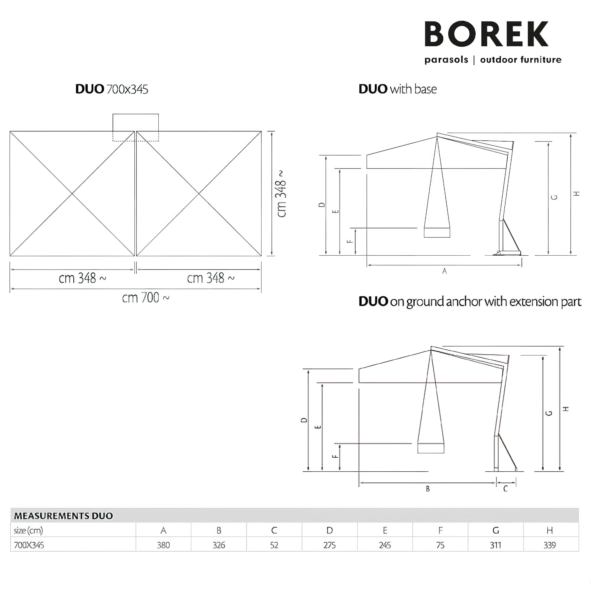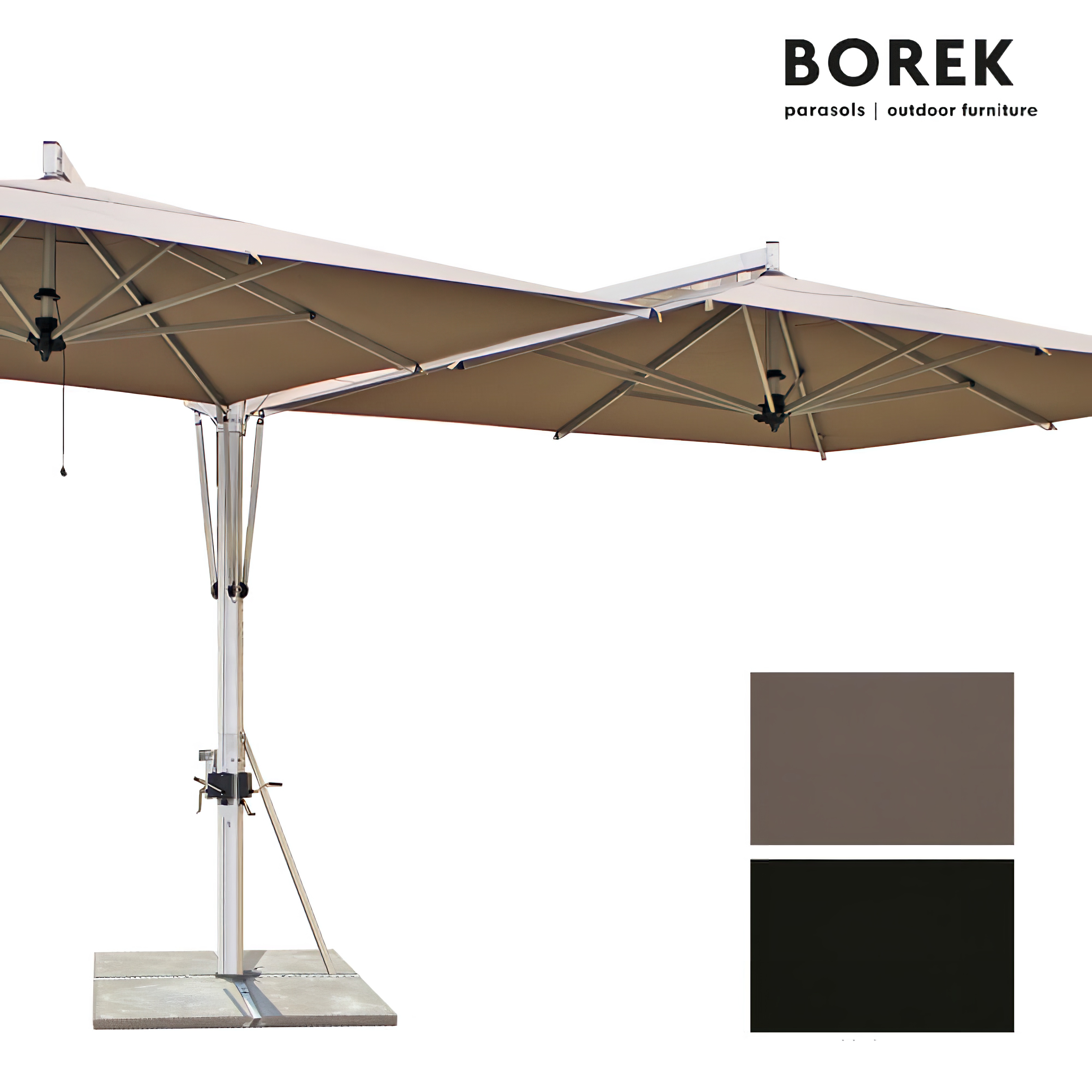 Ce parasol est un double parasol déporté de la célèbre marque de mobilier de jardin BOREK. Chaque parasol s'ouvre et se ferme facilement grâce à une manivelle. Ce double parasol séduit par sa structure en aluminium robuste et sa toile résistante en Sunbrella (taupe) ou Batyline (noir). Les deux tissus sont déperlants, bloquent les UV et conservent parfaitement leurs couleurs. La livraison s'effectue sans pied de parasol, une housse de protection est disponible en option dans notre boutique en ligne.