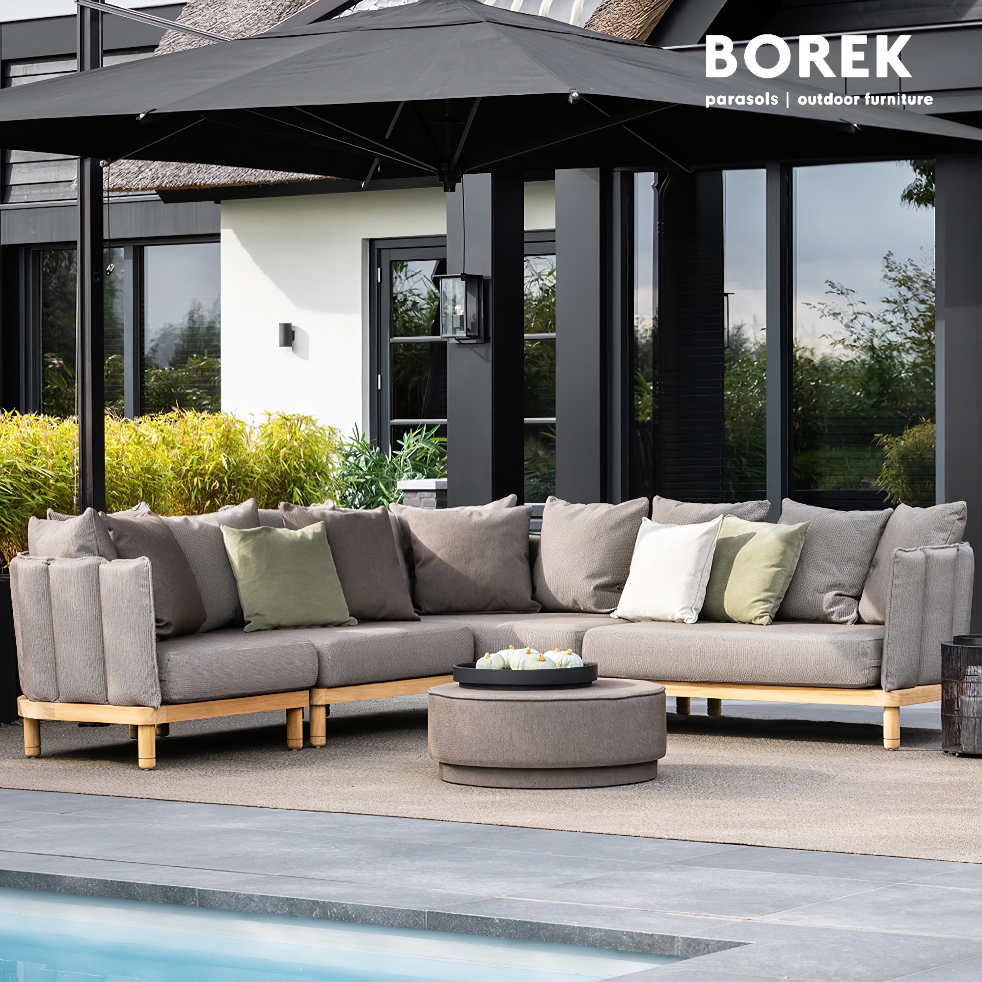 Le teck de l'espèce Tectona Grandis résiste bien aux rayons UV, au chlore et à l'eau salée. Avec le temps, ce bois dur non traité vieillit naturellement. De petites fissures sont normales et n'altèrent en rien sa robustesse naturelle. Il est conseillé de nettoyer régulièrement avec un nettoyant spécial teck. Un traitement complémentaire avec le Borek Teak Protector imprègne le bois, empêchant ainsi l'humidité et la saleté de pénétrer. Pour redonner un aspect frais au bois grisé, le Borek Teak Sealer est recommandé, car il fait ressortir la teinte brune naturelle du teck. L'aluminium facile d'entretien est revêtu par poudrage. Des coussins résistants Sunbrella assurent un grand confort d'assise.