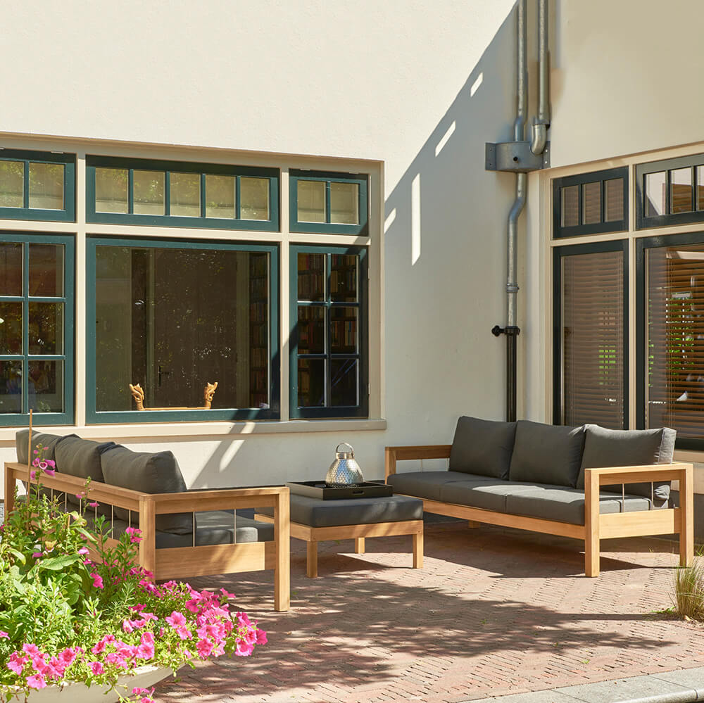 Le teck est un bois dur tropical à la teinte chaude miel-brun. Avec le temps, sous l'effet du vent et des intempéries, le bois développe une patine argentée et brillante très esthétique. Les amateurs de la teinte chaude peuvent ralentir ce processus de patinage et protéger le teck en utilisant notre Teak Sealer. Ce traitement doit être appliqué avant la première utilisation du mobilier. La fine lasure empêche l'oxydation en repoussant l'eau dans la structure du bois. Si vous préférez la couleur gris argenté, traitez le bois avec notre TEAK CLEANER après qu'il ait grisé. Veuillez ne jamais utiliser de nettoyeur haute pression pour nettoyer vos meubles de jardin.