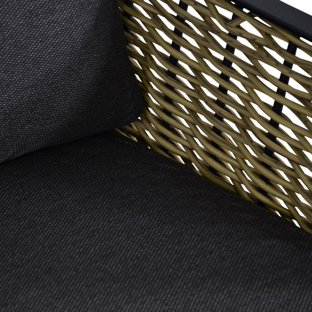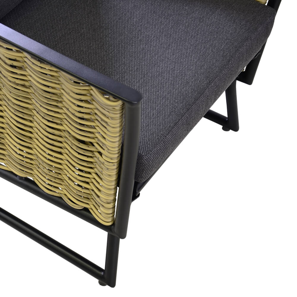 Ce salon robuste est fabriqué avec un cadre en aluminium anthracite, soumis à un contrôle qualité permanent. Les coussins d'assise et de dossier, épais de 8 cm, sont confectionnés avec une housse en Olefin de 270 g/m^2 et un rembourrage en coton. Le tressage en polyéthylène imite parfaitement l'aspect naturel du rotin. Le plateau de table, d'une épaisseur de 5 mm, est en verre noir. Ces meubles d'extérieur sont résistants aux intempéries. Pour leur nettoyage, un simple chiffon humide suffit. Il est déconseillé d'utiliser des produits acides, qui pourraient endommager la surface et compromettre leur résistance aux conditions climatiques.