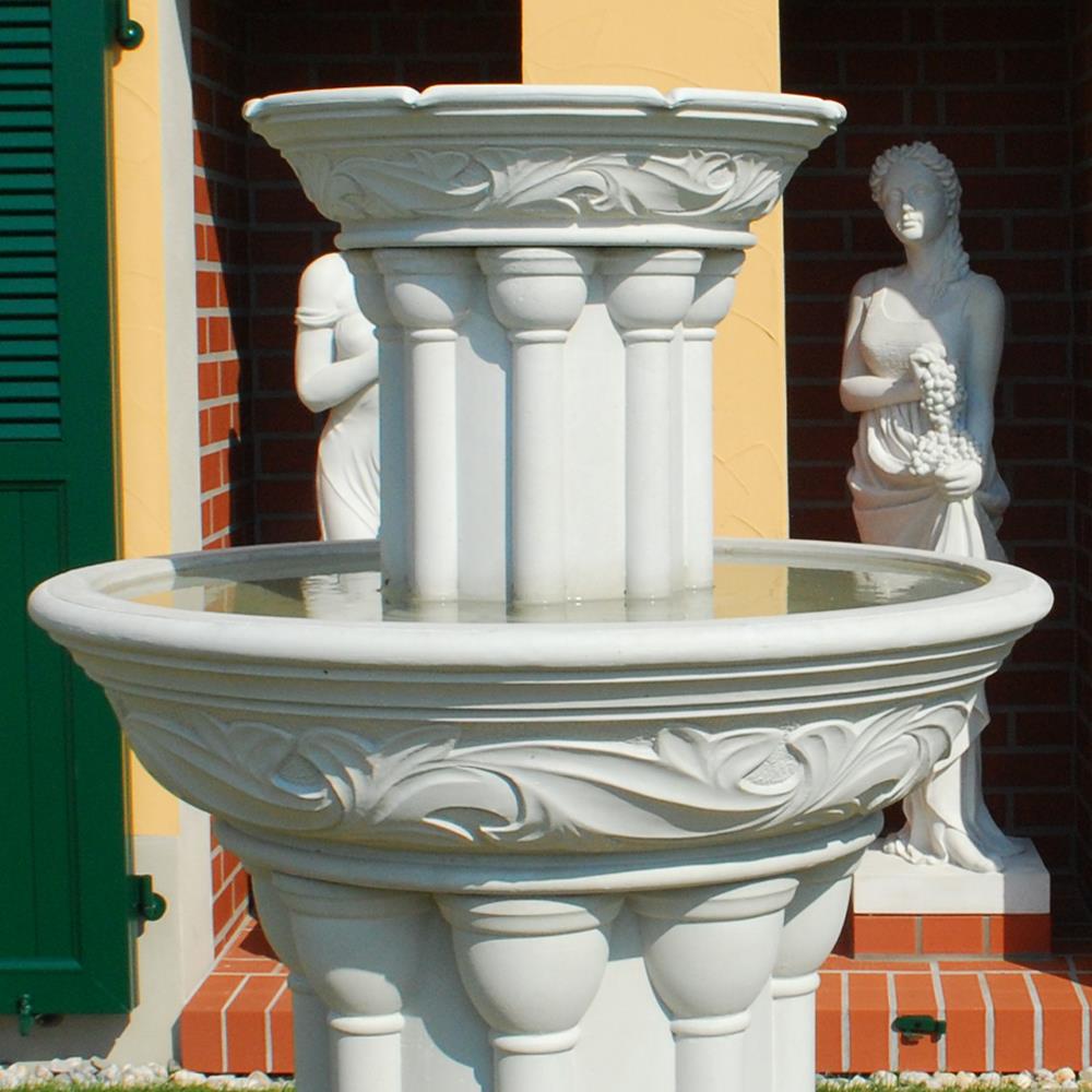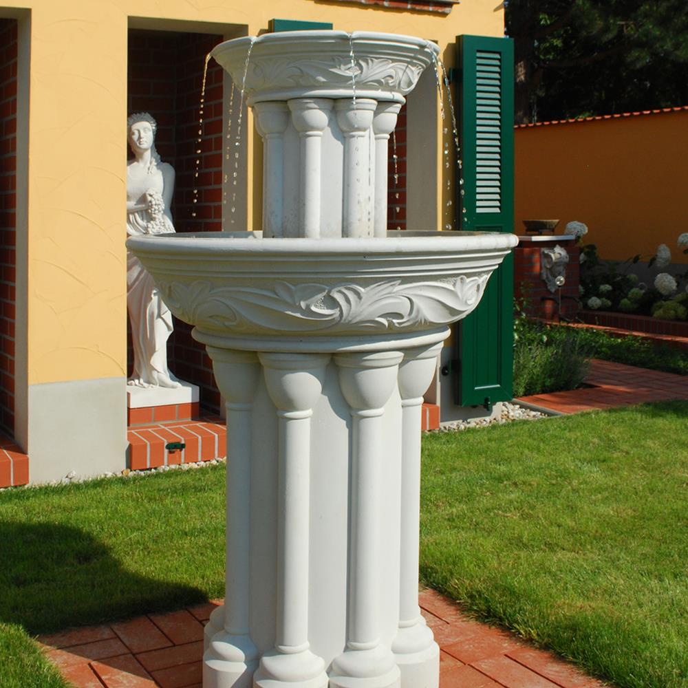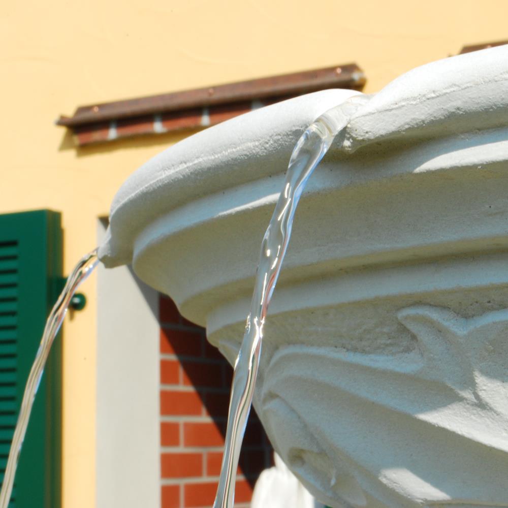 Avec cette fontaine sur pied au style antique, réalisée en pierre reconstituée de haute qualité, vous créez un véritable point focal dans votre jardin et posez les bases d'un décor extérieur élégant. Notre fontaine cascade "Dorney Court", où l'eau s'écoule en fines jets discrets du bord d'une petite vasque vers un grand bassin de réception, fait sensation aussi bien au centre du jardin que sur une terrasse spacieuse. Les bassins d'eau ornés d'un décor floral reposent sur des colonnes à la fois simples et raffinées. Nos fontaines en pierre reconstituée, conçues pour une décoration de jardin exceptionnelle, sont coulées avec soin à partir de matières premières naturelles et précieuses telles que la poudre de grès, l'eau et des additifs minéraux selon des recettes strictes, et résistent à toutes les conditions climatiques, y compris le gel, la pluie et un fort ensoleillement. Cependant, les bassins, fontaines et pompes doivent être vidés en cas de gel. Cette magnifique fontaine en pierre est livrée sans frais de port en Suisse et comprend une pompe fonctionnant en circuit fermé.