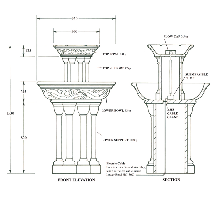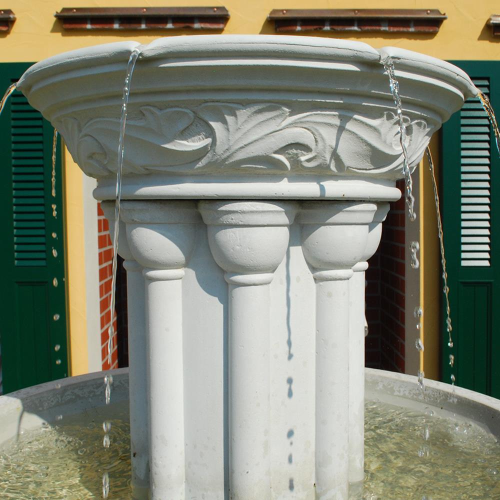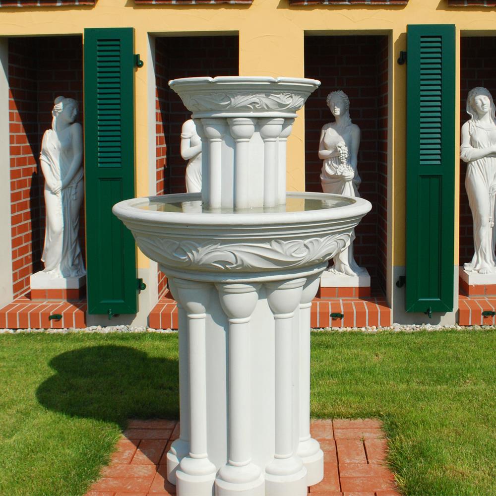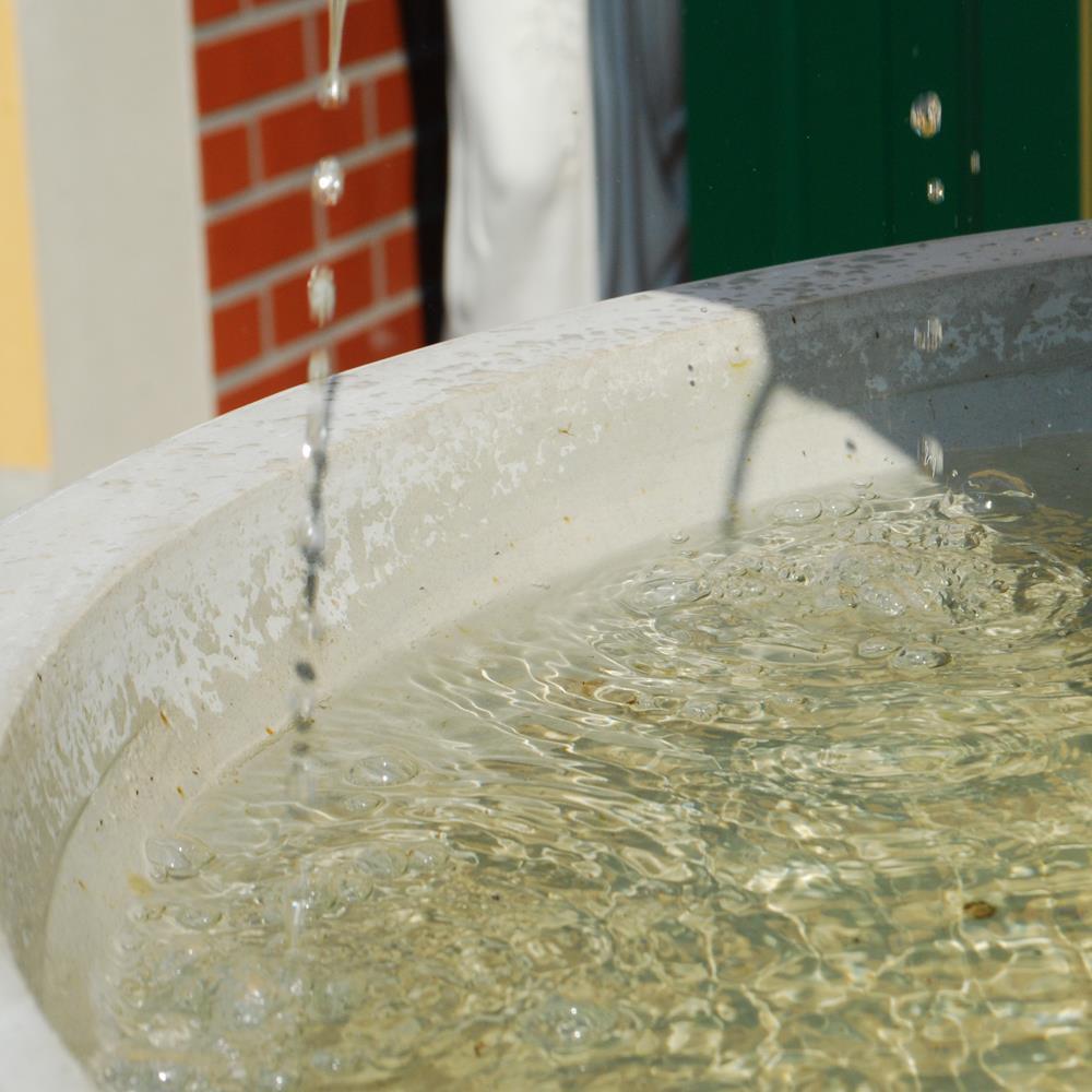 Avec cette fontaine sur pied au style antique, réalisée en pierre reconstituée de haute qualité, vous créez un véritable point focal dans votre jardin et posez les bases d'un décor extérieur élégant. Notre fontaine cascade "Dorney Court", où l'eau s'écoule en fines jets discrets du bord d'une petite vasque vers un grand bassin de réception, fait sensation aussi bien au centre du jardin que sur une terrasse spacieuse. Les bassins d'eau ornés d'un décor floral reposent sur des colonnes à la fois simples et raffinées. Nos fontaines en pierre reconstituée, conçues pour une décoration de jardin exceptionnelle, sont coulées avec soin à partir de matières premières naturelles et précieuses telles que la poudre de grès, l'eau et des additifs minéraux selon des recettes strictes, et résistent à toutes les conditions climatiques, y compris le gel, la pluie et un fort ensoleillement. Cependant, les bassins, fontaines et pompes doivent être vidés en cas de gel. Cette magnifique fontaine en pierre est livrée sans frais de port en Suisse et comprend une pompe fonctionnant en circuit fermé.