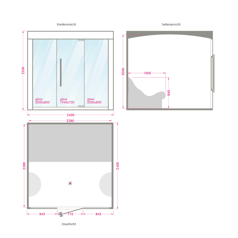 Vous recevrez un plan 2D personnalisé. Nous serons ravis de créer avec vous une oasis de bien-être conforme à vos attentes. À organiser par vos soins :