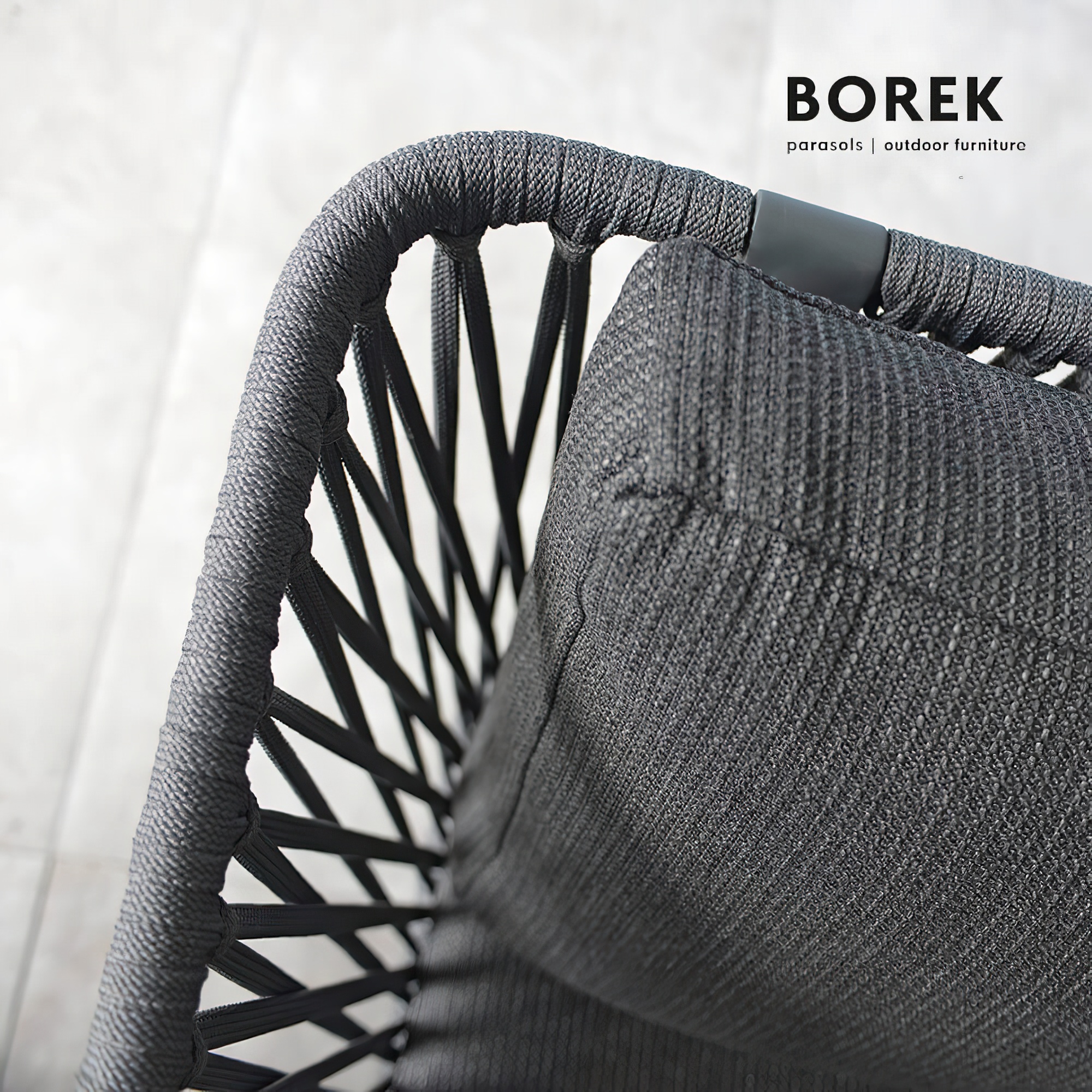 Le mobilier de jardin Borek se distingue par sa robustesse durable et son style moderne. La structure est généralement réalisée en alliage d'aluminium de haute qualité, thermolaqué à 180 degrés. Les matériaux utilisés pour la toile sont également haut de gamme. Le fauteuil de jardin est résistant au gel et à la chaleur, tout en étant facile d'entretien. En plus des chaises de jardin, le fabricant propose également des meubles lounge, des transats et des parasols, que vous pouvez commander en ligne dans notre boutique. La corde Ardenza peut être nettoyée avec le Borek Fabric Cleaner et protégée avec le Borek Fabric Protector. Une housse de protection adaptée est disponible pour ce meuble d'extérieur.