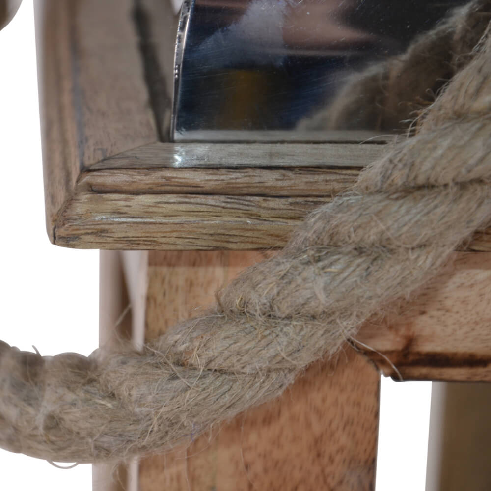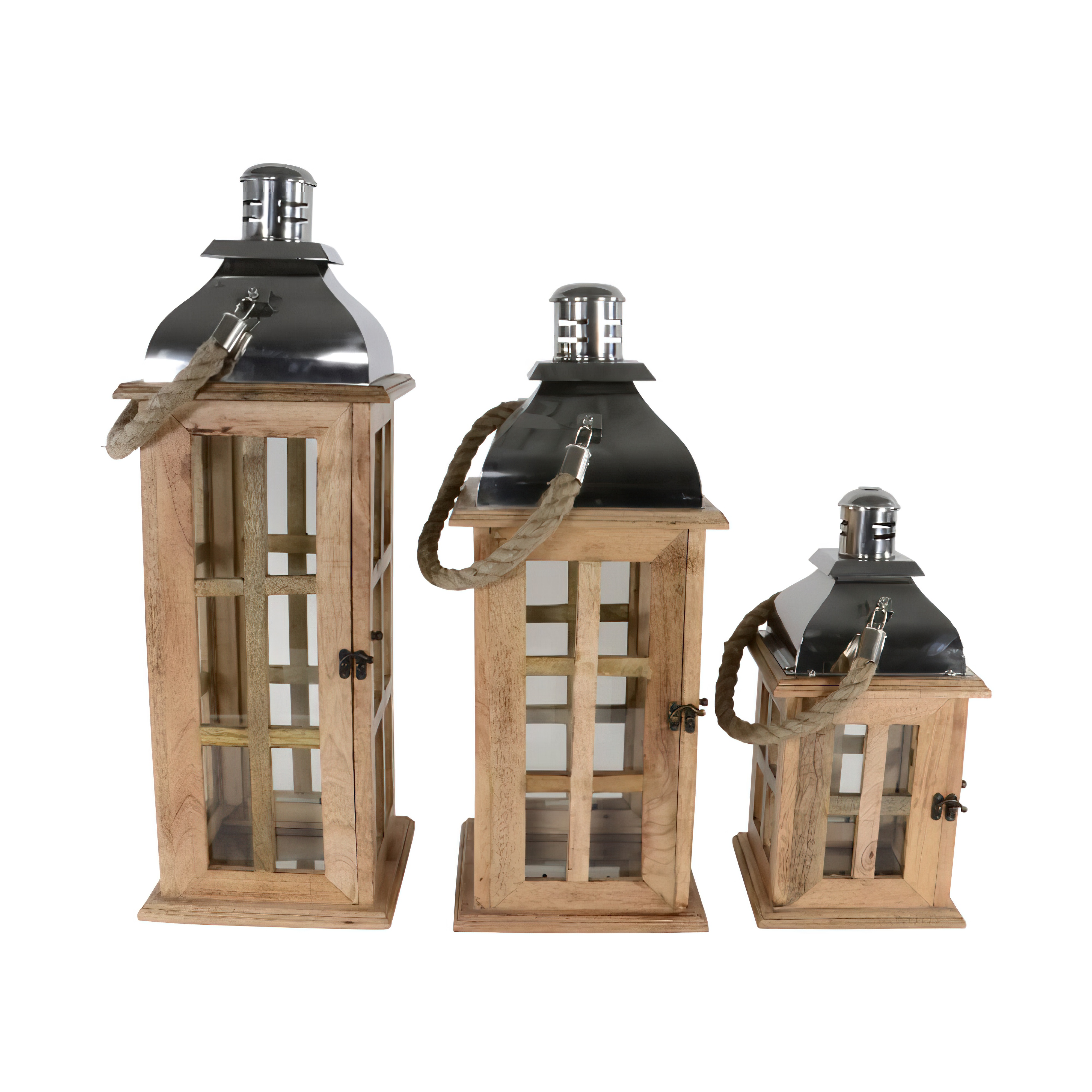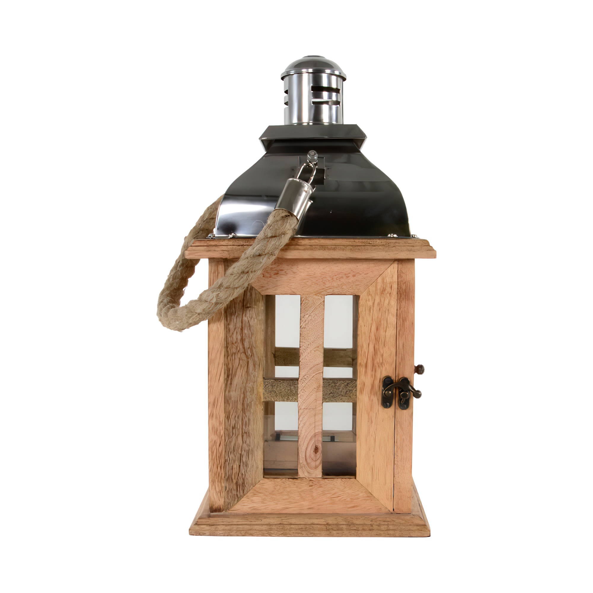 Braune Holzlaternen mit Metalldach und Kordel - Laterne Linus / 40x20x20cm (HxBxT)