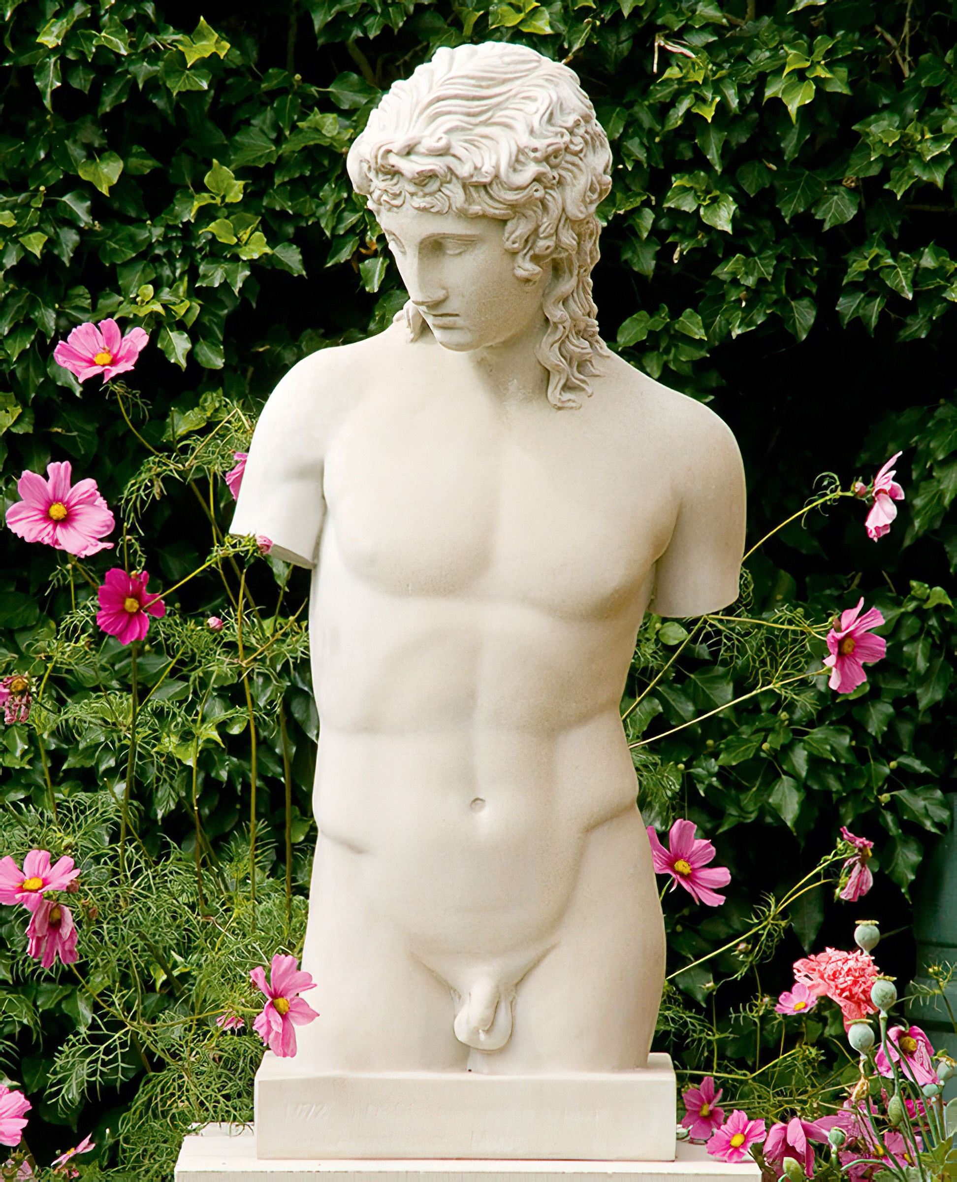 Kleine Akt-Gartenfigur mit Sockel aus Steinguss - Männer Torso - Kopara / Portland weiß