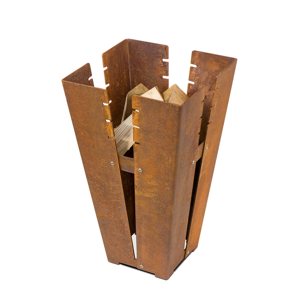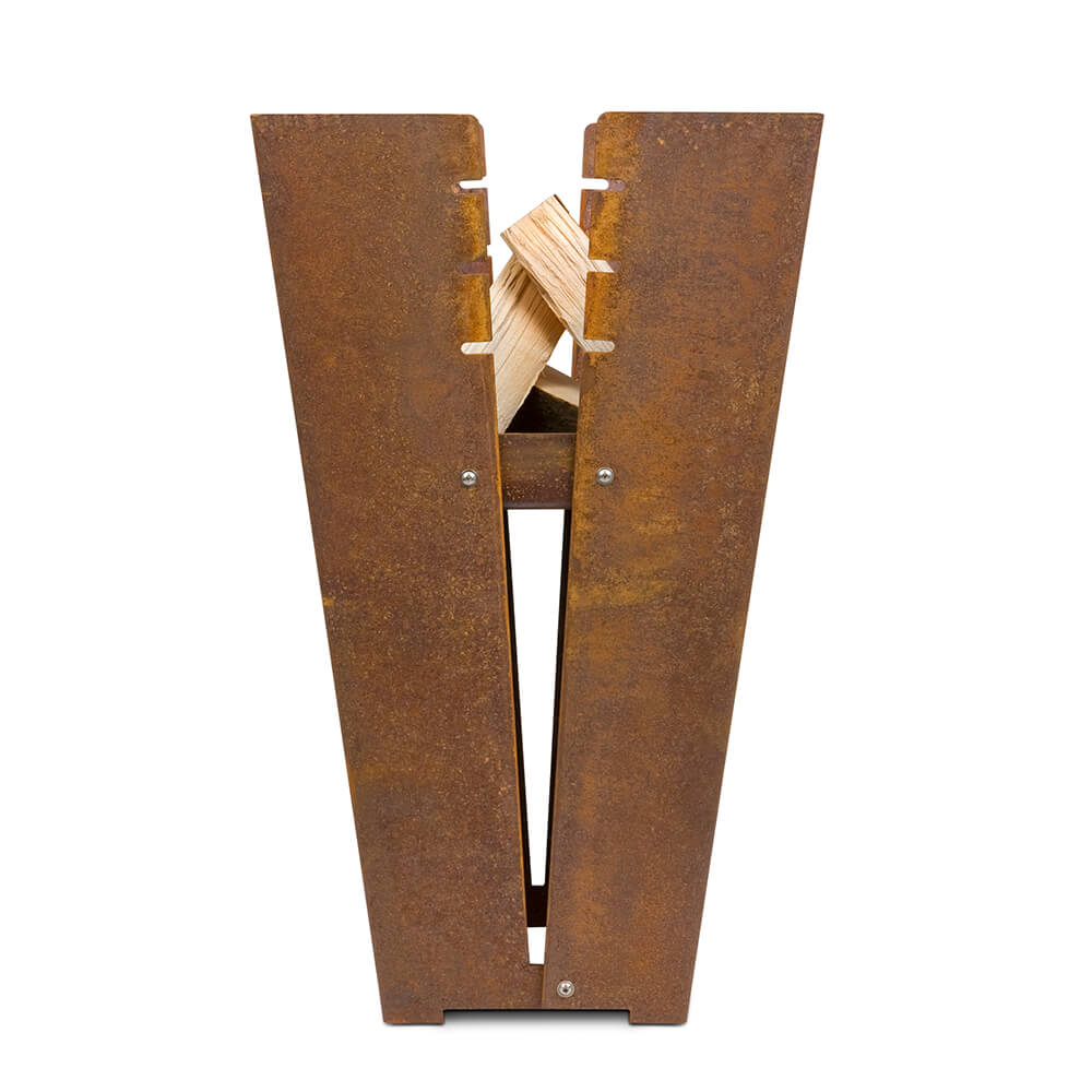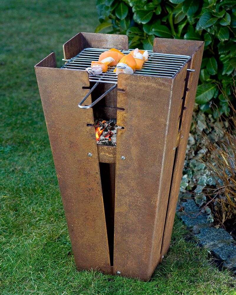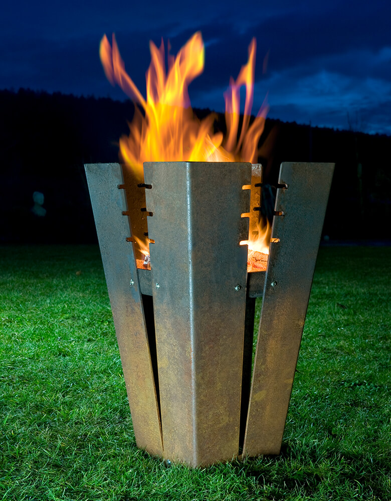 Tous nos braseros sont conçus en acier brut, résistant aux intempéries. La belle patine rouillée se développe naturellement avec le temps grâce à l'oxydation. Veuillez noter que des traces de rouille peuvent apparaître à l'emplacement d'installation. Le brasero peut être retiré pour le nettoyage. Grâce à des tôles de haute qualité et un travail soigné, il n'y a pas de déformation lors de l'utilisation. Lors d'un feu de camp, de la suie et des cendres se forment inévitablement. Nettoyer un foyer va à l'encontre de la tradition du feu. La forme sculpturale du foyer ressemble alors à une œuvre d'art – la suie, les cendres et la graisse n'altèrent en rien son apparence.