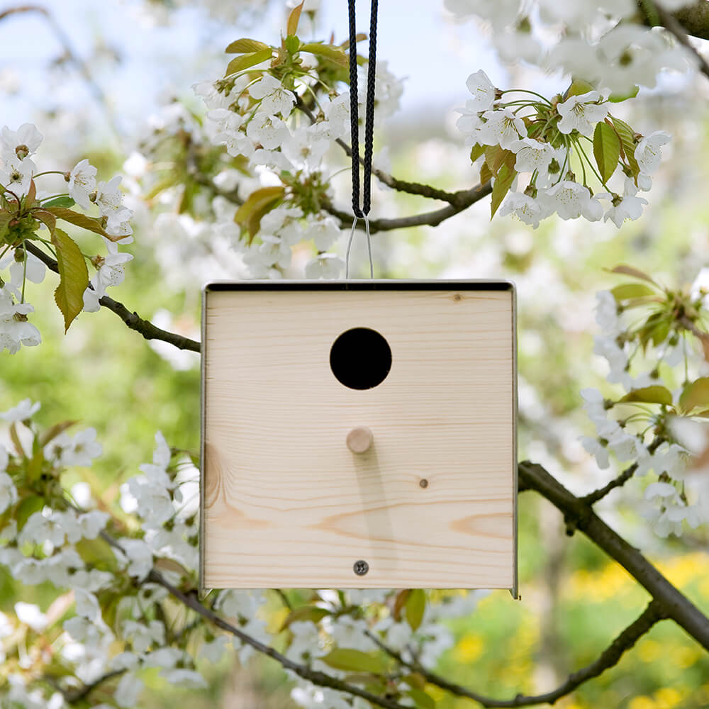 Le nichoir unique GANYMEDES séduit par son design moderne et sa finition de haute qualité. Sa coque extérieure en acier inoxydable ou résistant aux intempéries protège efficacement contre la pluie. L'intérieur est entièrement en bois, et le couvercle en acier ne touche pas directement le bois, permettant ainsi une bonne circulation de l'air. L'entrée a un diamètre d'environ 3,2 cm. Pour les modèles laqués, seules des peintures écologiques et résistantes aux intempéries sont utilisées. Ce nichoir peut être fixé sur un poteau, suspendu à une branche ou fixé à un tronc d'arbre ou à un mur de maison.