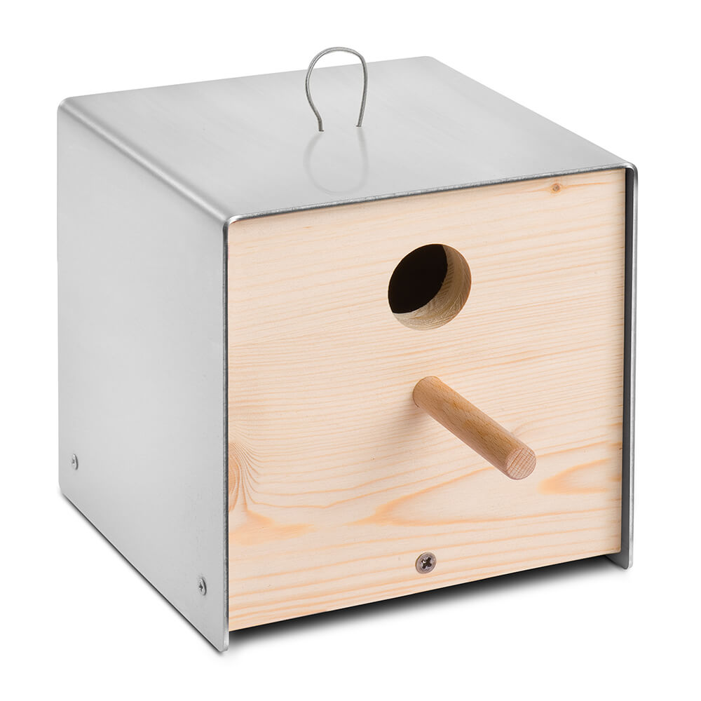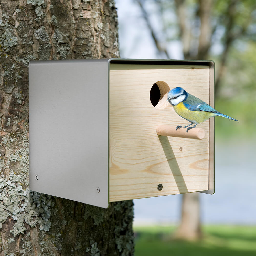 Design Vogel Nistkasten aus Holz & Edelstahl - Ganymedes / Silber