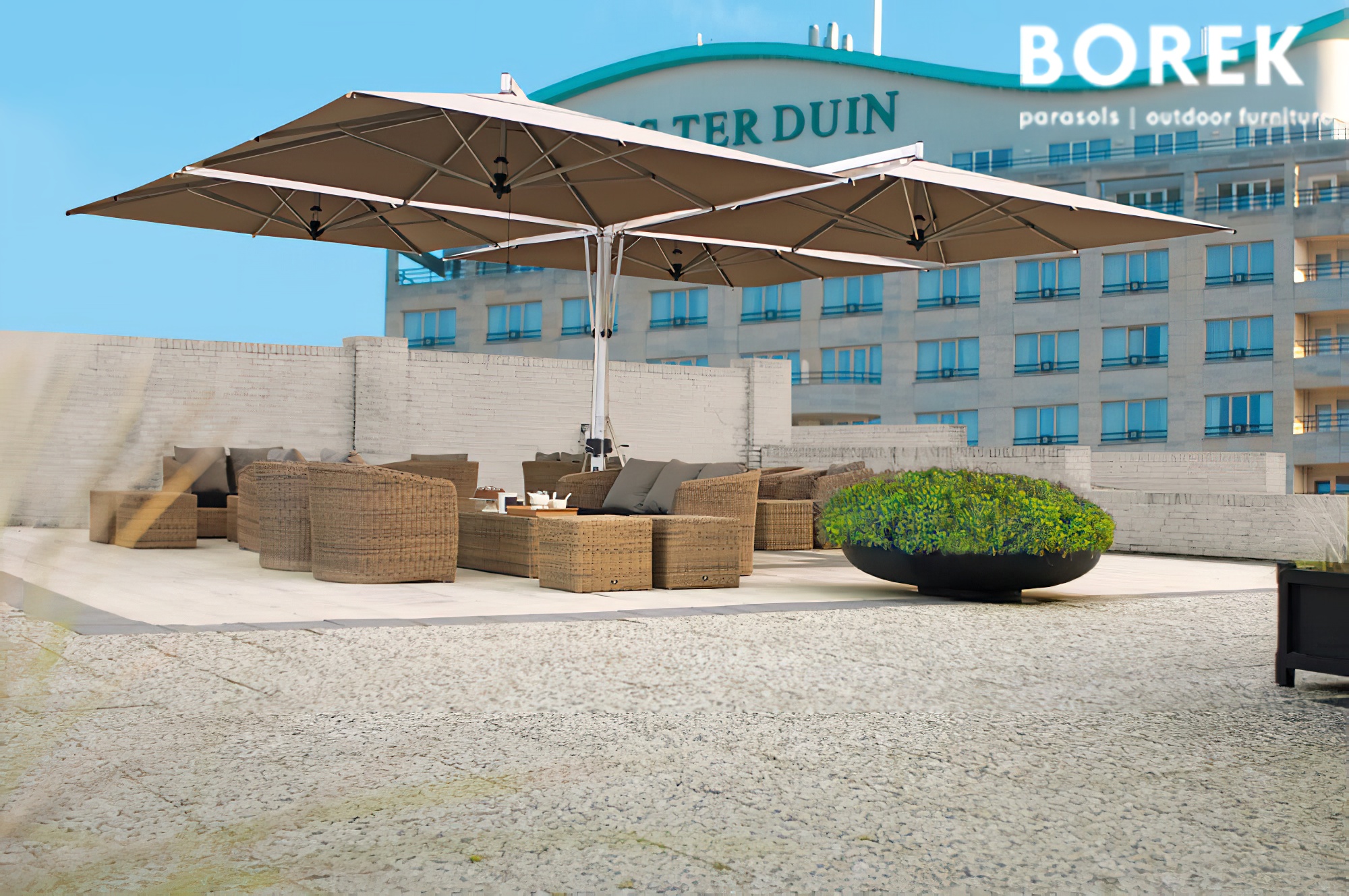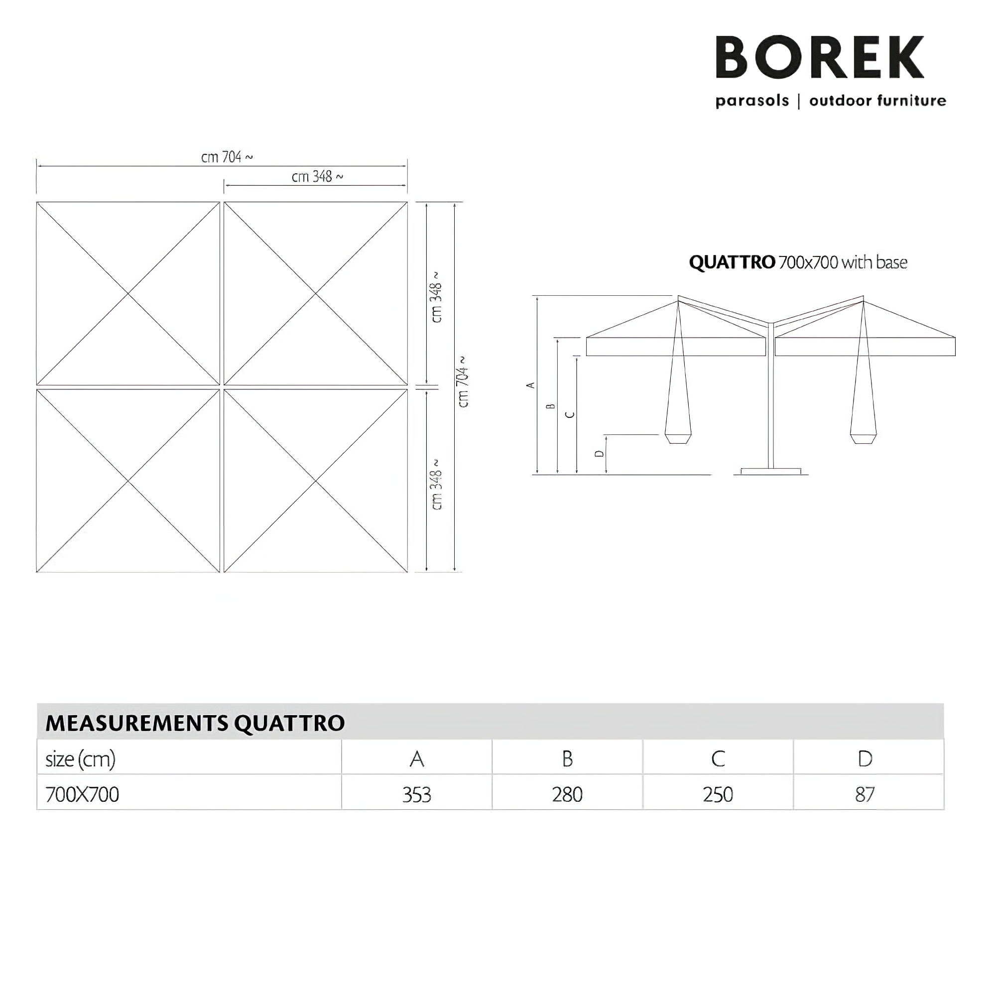 Ce parasol unique est idéal pour les restaurants, mais il trouvera également sa place dans un jardin ou sur une grande terrasse, offrant une ombre généreuse grâce au modèle QUATTRO. Chaque segment peut être ouvert et fermé individuellement à l'aide d'une manivelle. La structure en aluminium est robuste et durable. Les toiles sont disponibles en Sunbrella (Taupe) ou Batyline (Noir), toutes deux déperlantes, opaques aux UV et résistantes à la décoloration. Le parasol XXL à bras déporté est livré sans pied de parasol, mais une housse de protection peut être commandée en option dans notre boutique en ligne.