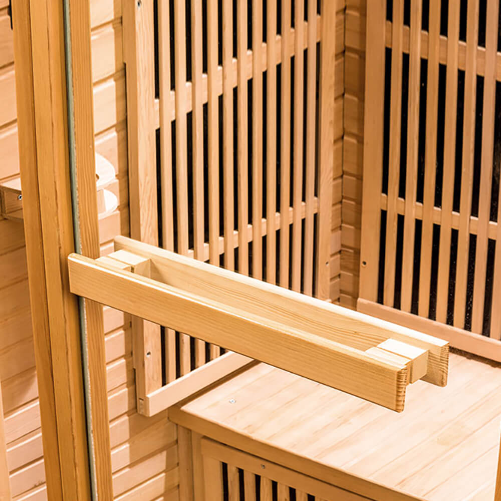 Le bois utilisé est durable, léger et tendre, avec de bonnes propriétés isolantes thermiques et une structure naturellement lisse. Sa teinte naturelle jaune clair à brun clair crée une ambiance chaleureuse dans le sauna. Le bois de pruche canadienne est particulièrement adapté pour les saunas car il résiste bien à l'humidité et contient peu de résine. Cette dernière caractéristique rend notre sauna idéal également pour les personnes légèrement allergiques au bois.
