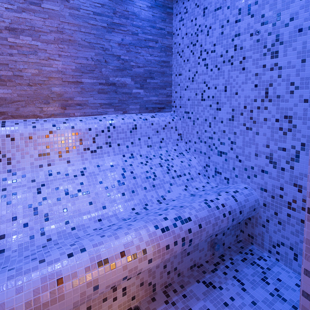 Edles Indoor Dampfbad mit Naturstein Wand und Mosaik Sitzbänken - Chavi