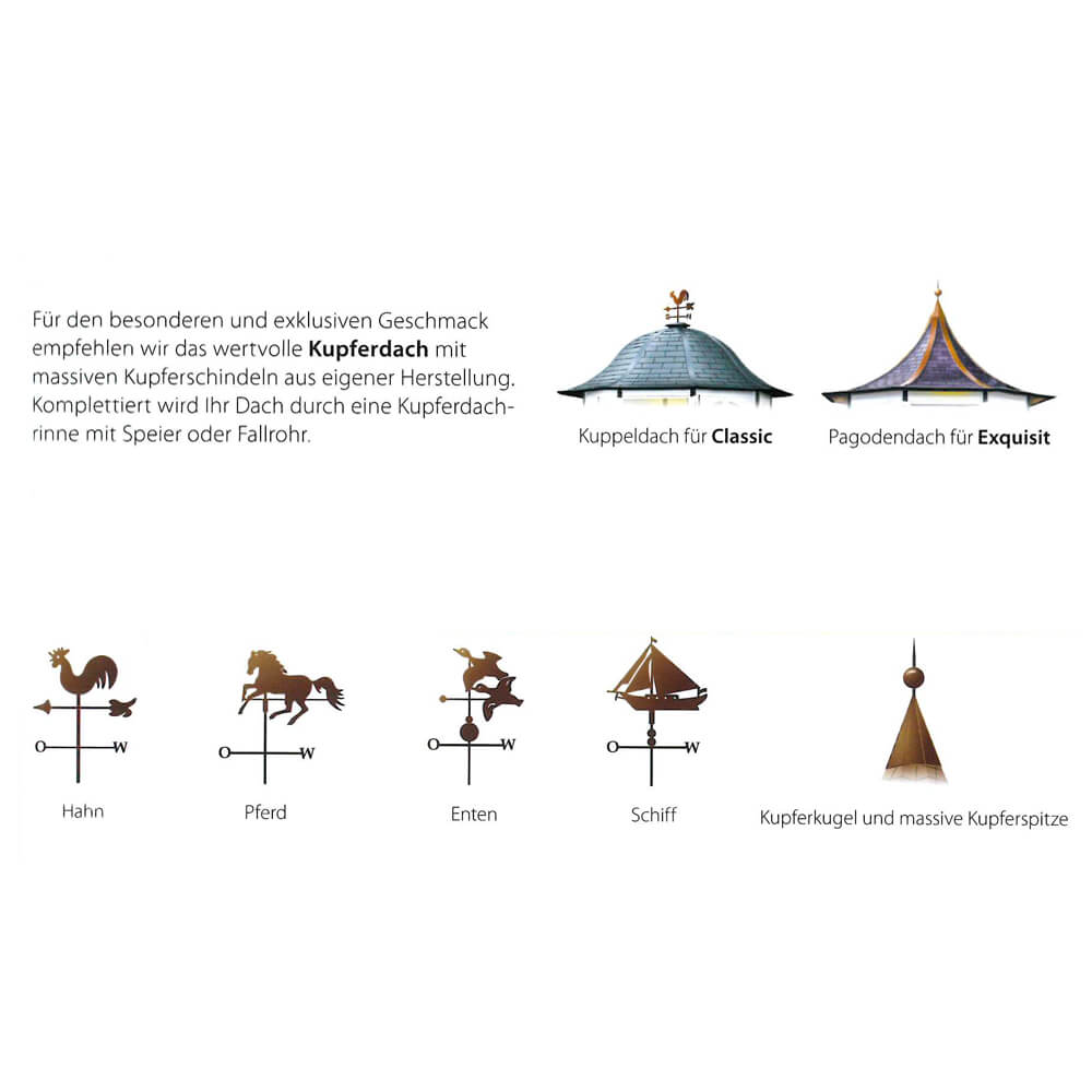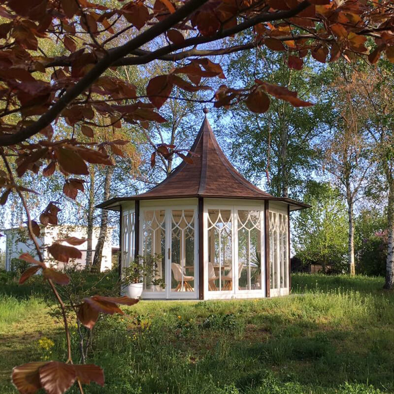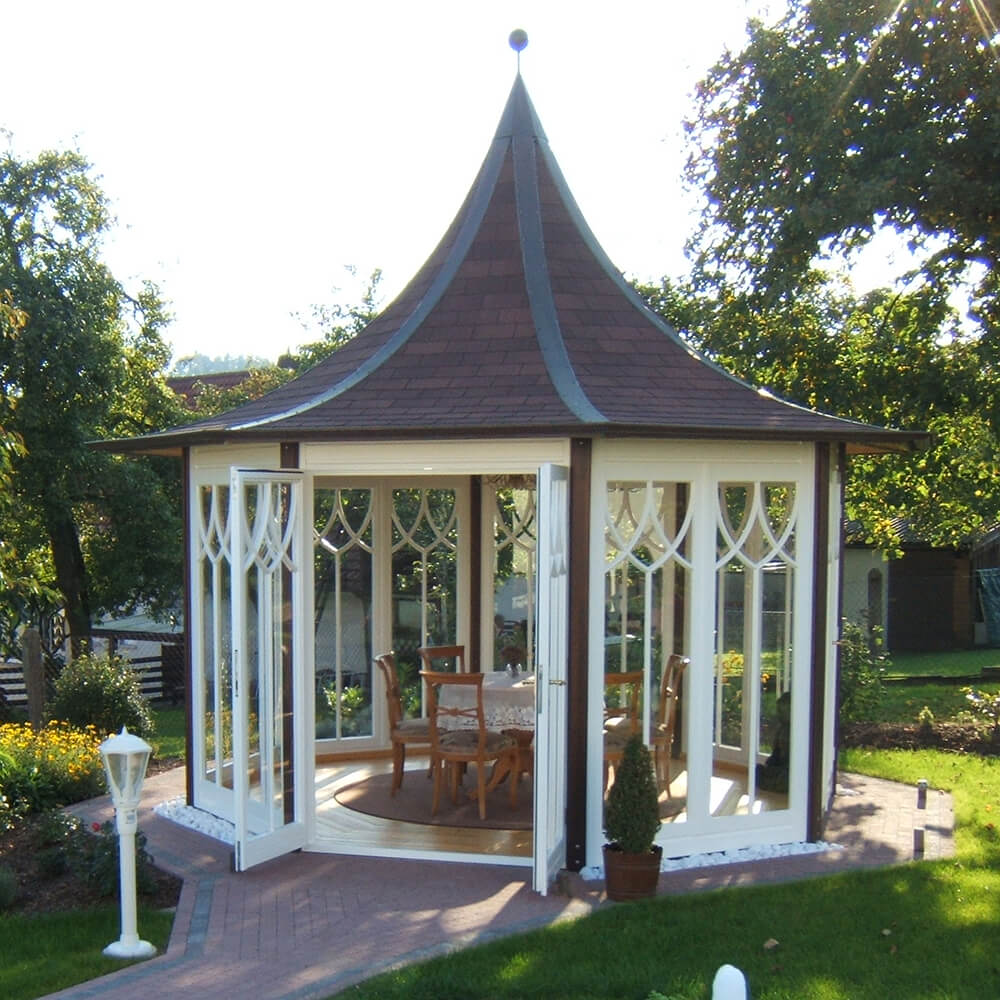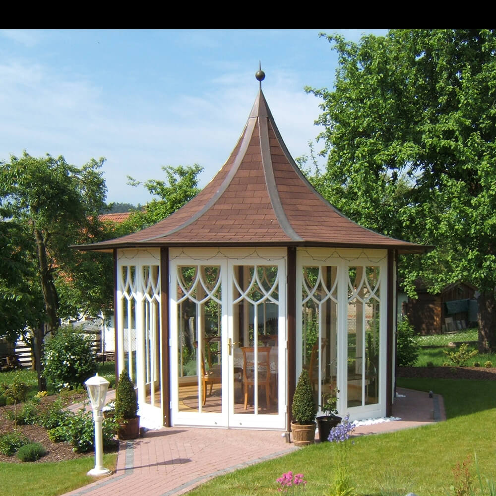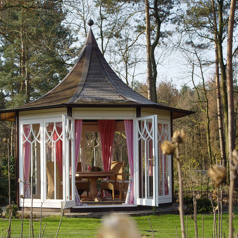 Que ce soit avec 6 ou 12 côtés, les possibilités de forme et de design sont presque illimitées. Nous créons volontiers avec vous le pavillon unique de vos rêves pour l'extérieur. Pour une offre sans engagement, veuillez nous communiquer vos préférences concernant les variantes possibles d'aménagement extérieur :