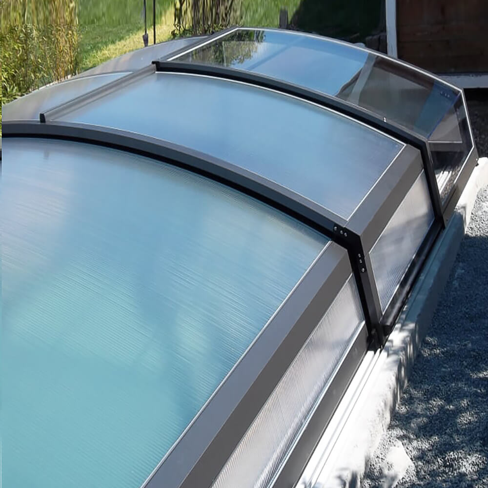 Ce couvercle de piscine légèrement courbé dispose de parois frontales amovibles à l'avant et à l'arrière. Pour la vitrification, nous utilisons des plaques alvéolaires en polycarbonate. Ces remplissages robustes avec filtre UV double face, fixés aux profils par un mastic silicone, sont disponibles en épaisseur standard de 10 mm (standard ou fumé) ou en 4 mm (transparent clair). Le kit comprend des rails de sol coulissants unilatéraux pour les deux côtés, sans rails d'extension. Voici les principales caractéristiques en un coup d'œil :