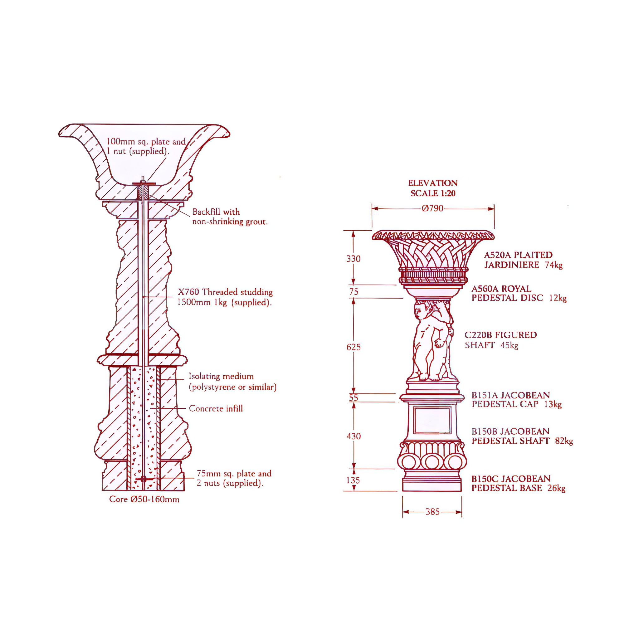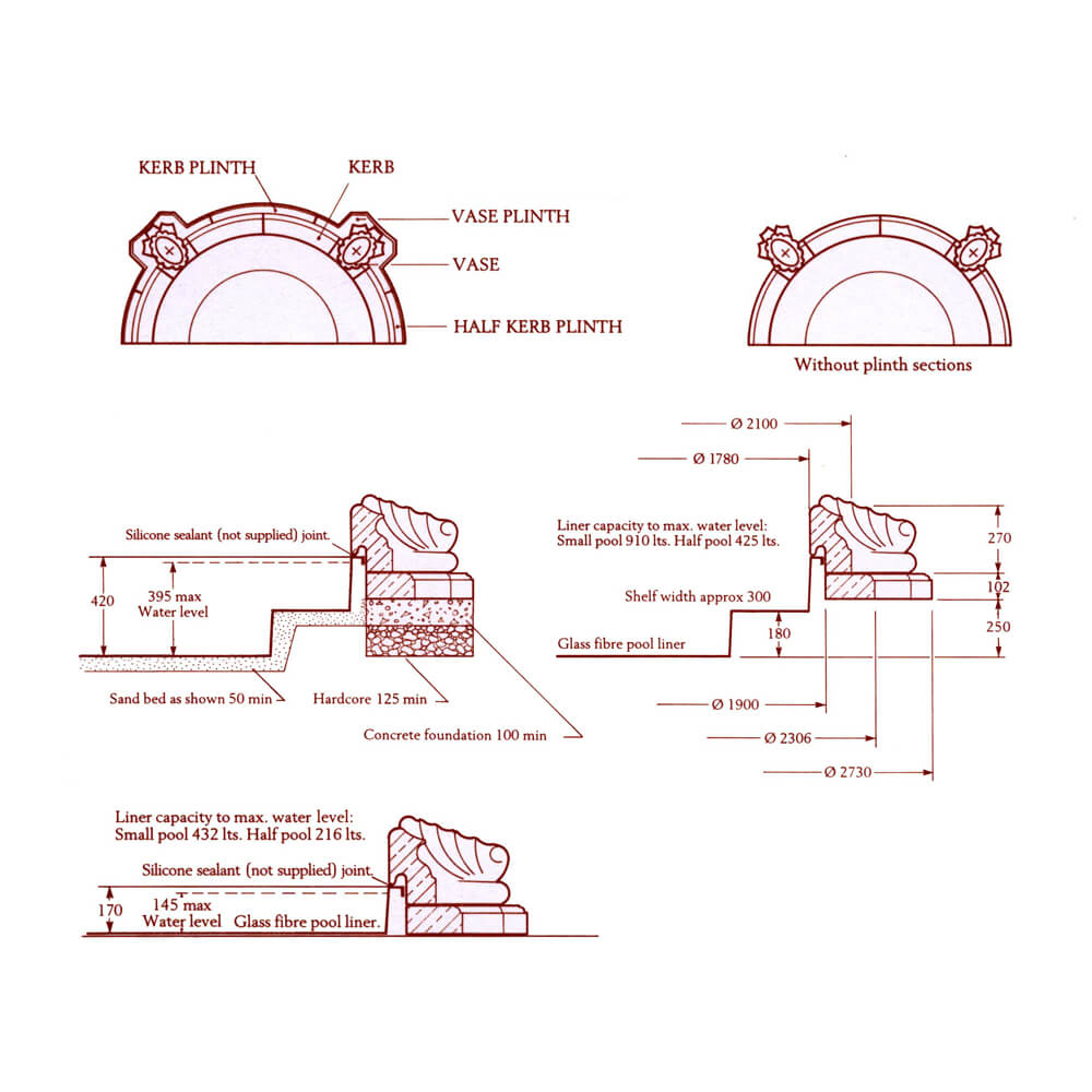 La demi-fontaine est coulée à partir d'un mélange robuste de grès et d'agrégats, puis soigneusement sculptée à la main par le tailleur de pierre. L'image montre la version sans socles. En option, la fontaine de jardin peut être réalisée avec socles et/ou sans vases. Nous serons ravis de vous préparer une offre personnalisée à ce sujet.