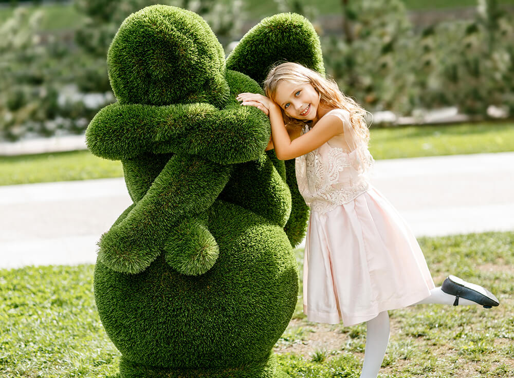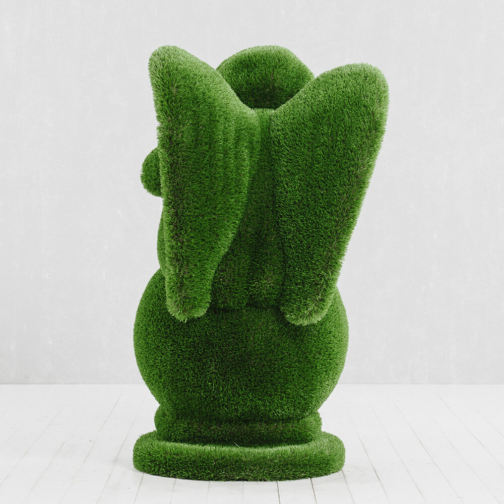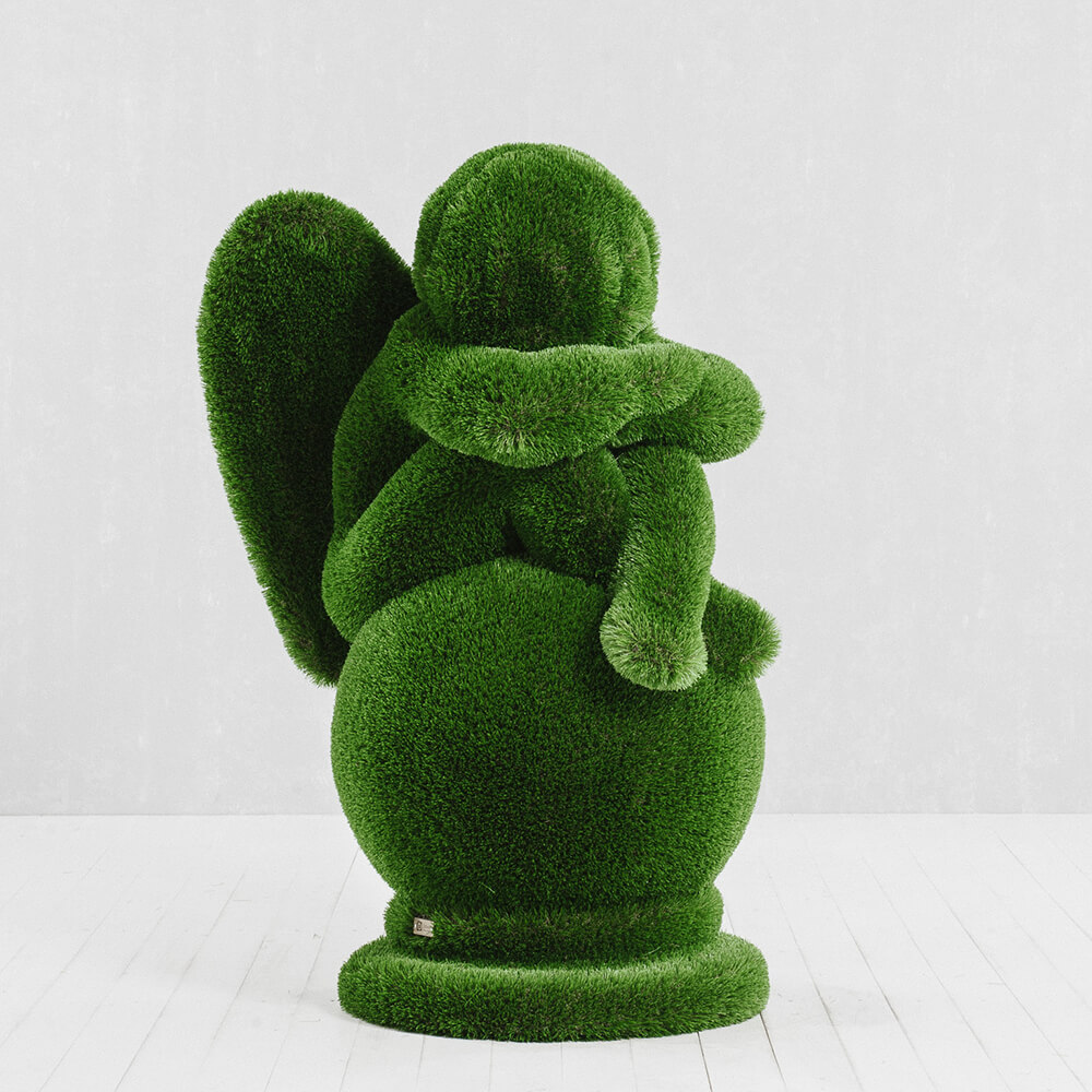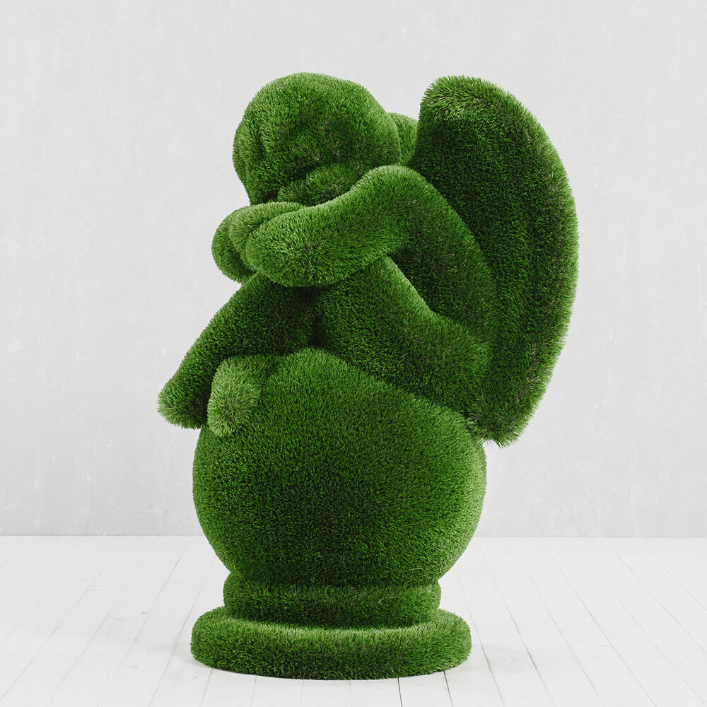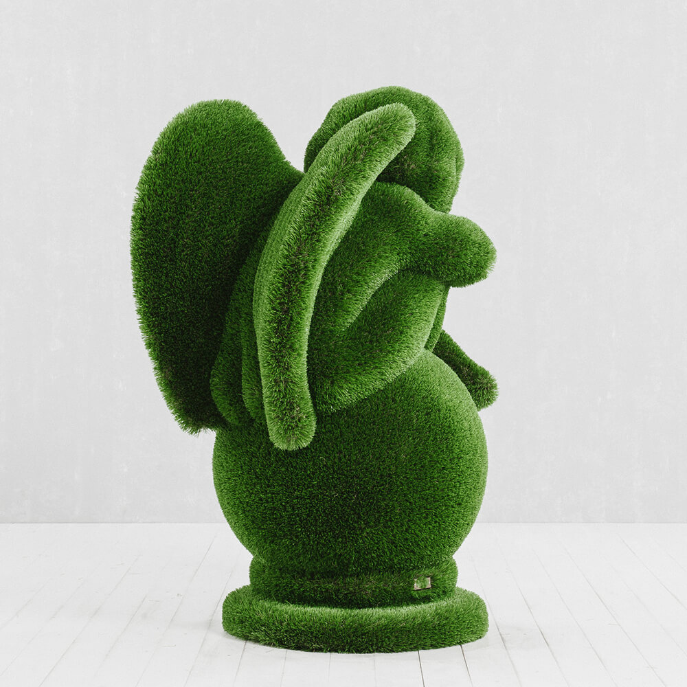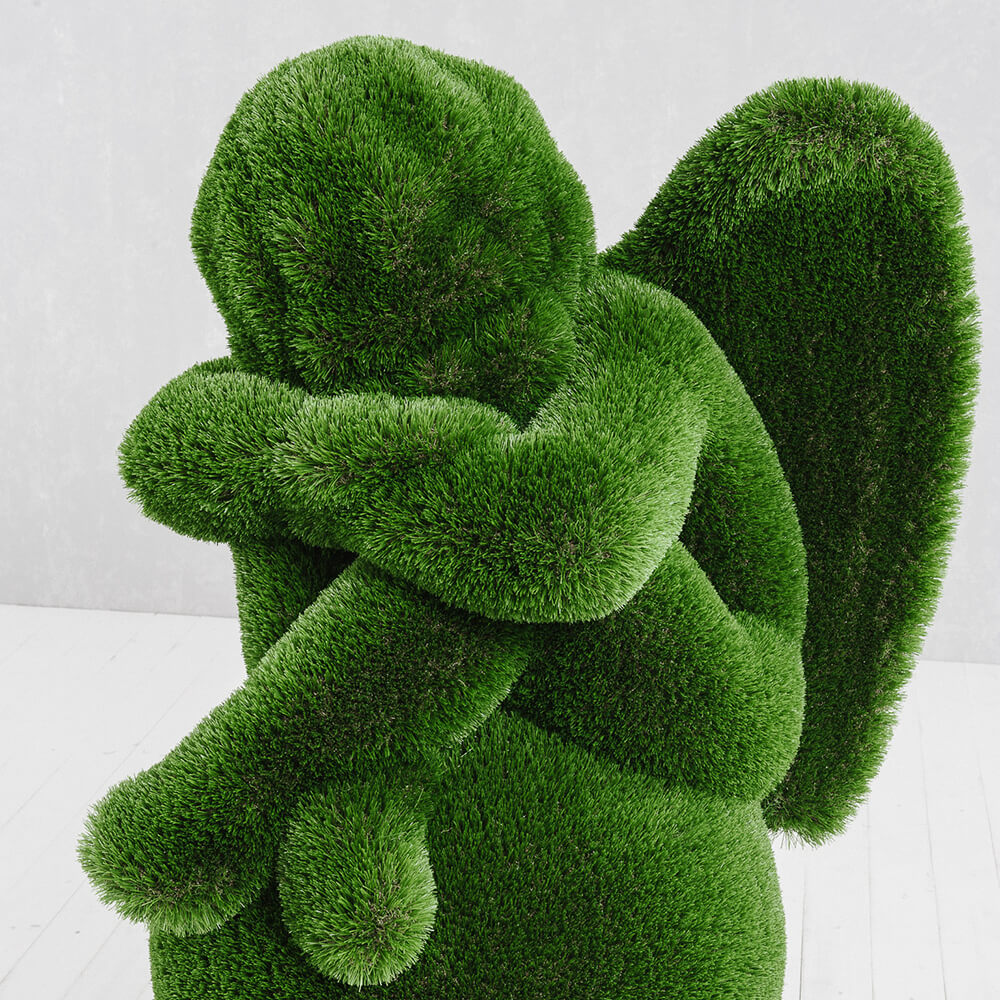 Toutes les figures sont d'abord conçues en modèle 3D sur ordinateur. Ensuite, la structure en fibre de verre est fabriquée et recouverte manuellement de gazon synthétique. Chaque sculpture est ainsi une pièce unique. Grâce à la structure en fibre de verre, les topiaires sont particulièrement légères, résistantes aux chocs et durables - elles ne rouillent pas, résistent à la corrosion, aux variations de température et aux UV. Aucun entretien supplémentaire n'est nécessaire. La limite de poids pour les figures taillées se situe entre 30 et 250 kg. Il est important de les installer loin des sources de feu.