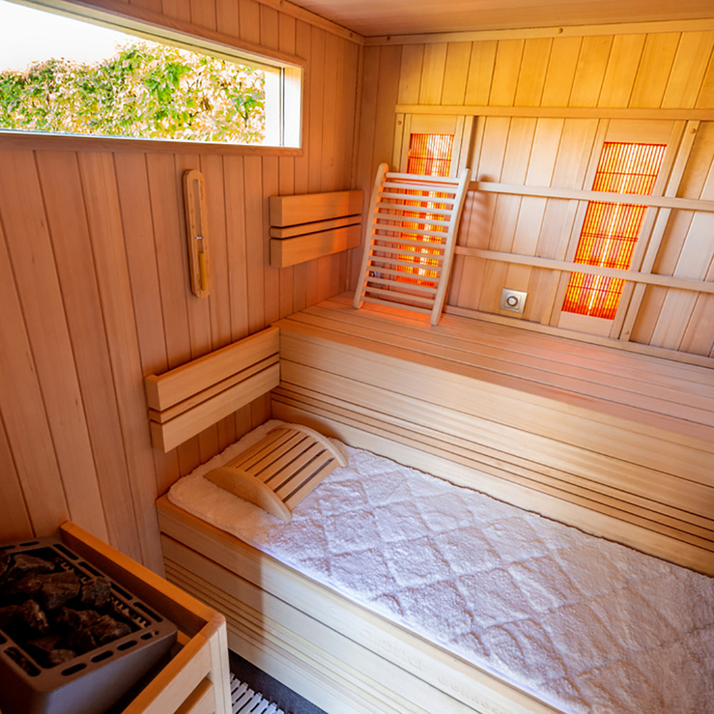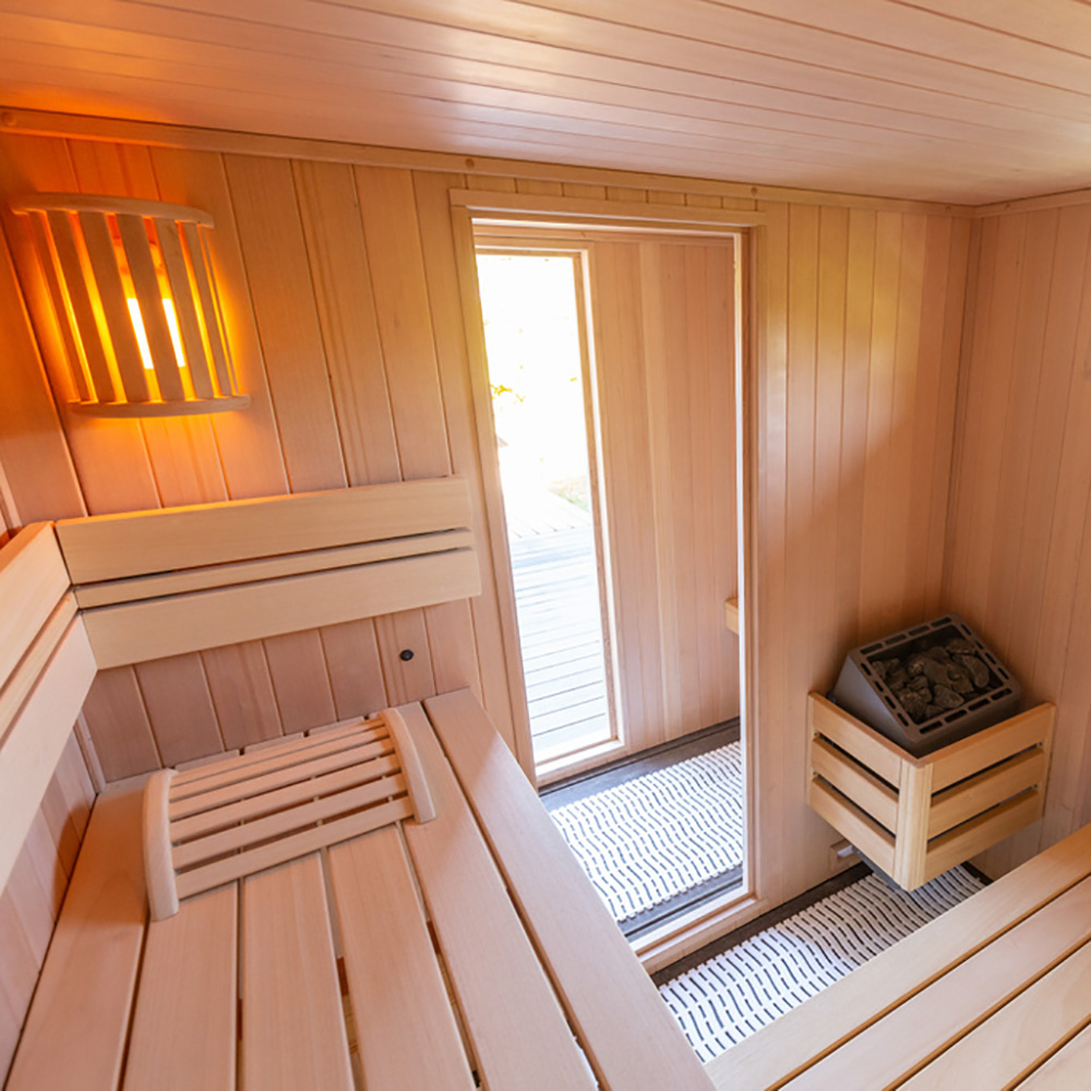 - Inclus tapis antidérapant, appuie-têtes, lampe sauna et set sauna