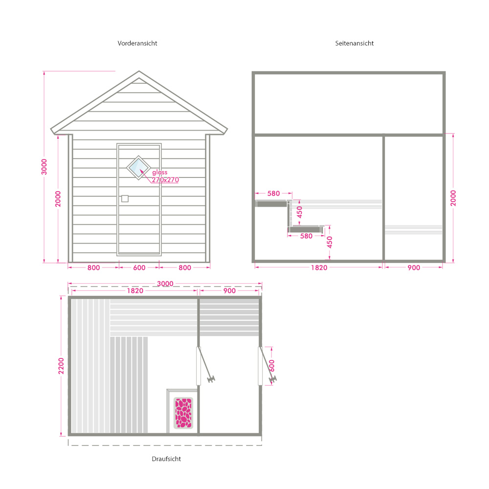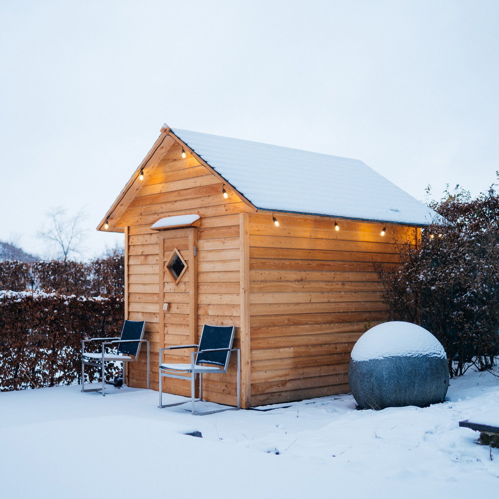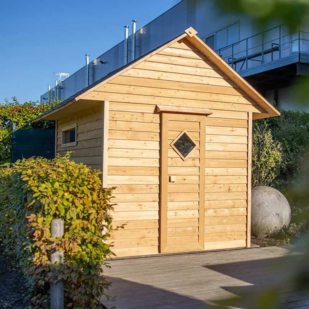Le sauna de jardin est livré avec un équipement complet. Certains éléments doivent être choisis par vos soins. Des souhaits supplémentaires de design et d'équipement ainsi que des solutions bien-être sur mesure sont possibles. Voici un aperçu de l'équipement standard :