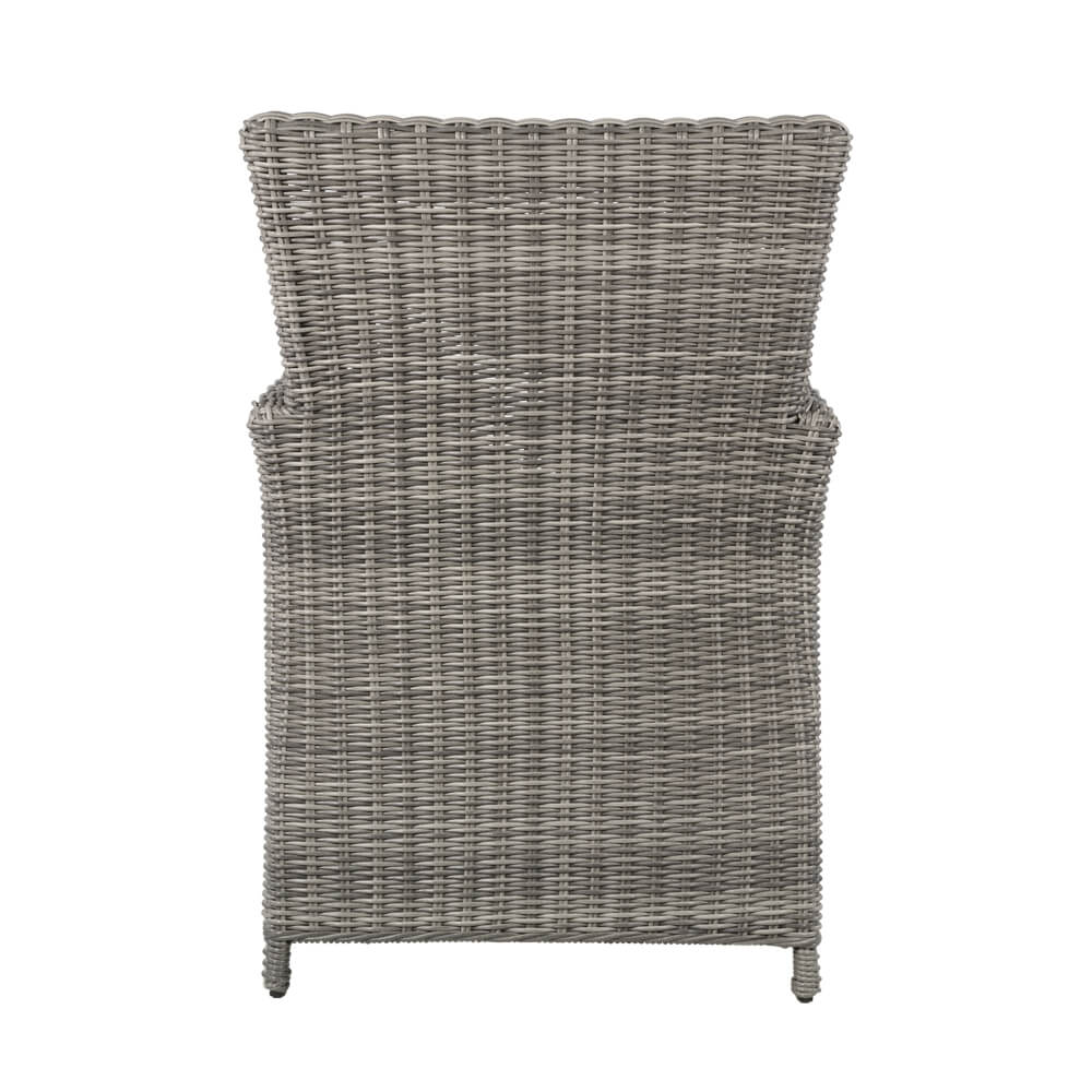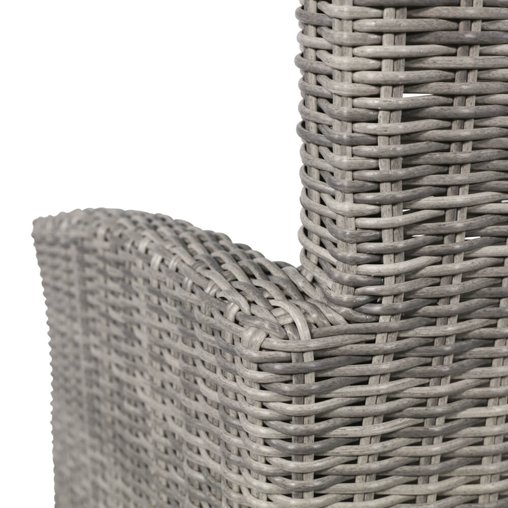 Ce fauteuil de jardin est fabriqué en polyrotin et aluminium sous un contrôle qualité rigoureux. Ce meuble d'extérieur résiste aux intempéries et peut être utilisé toute l'année en plein air. Les coussins épais sont confectionnés en polyester avec un rembourrage en mousse et coton. Pour le nettoyage, un simple chiffon humide suffit. Il est déconseillé d'utiliser des produits nettoyants acides, car ils pourraient endommager la surface et compromettre la résistance aux intempéries.