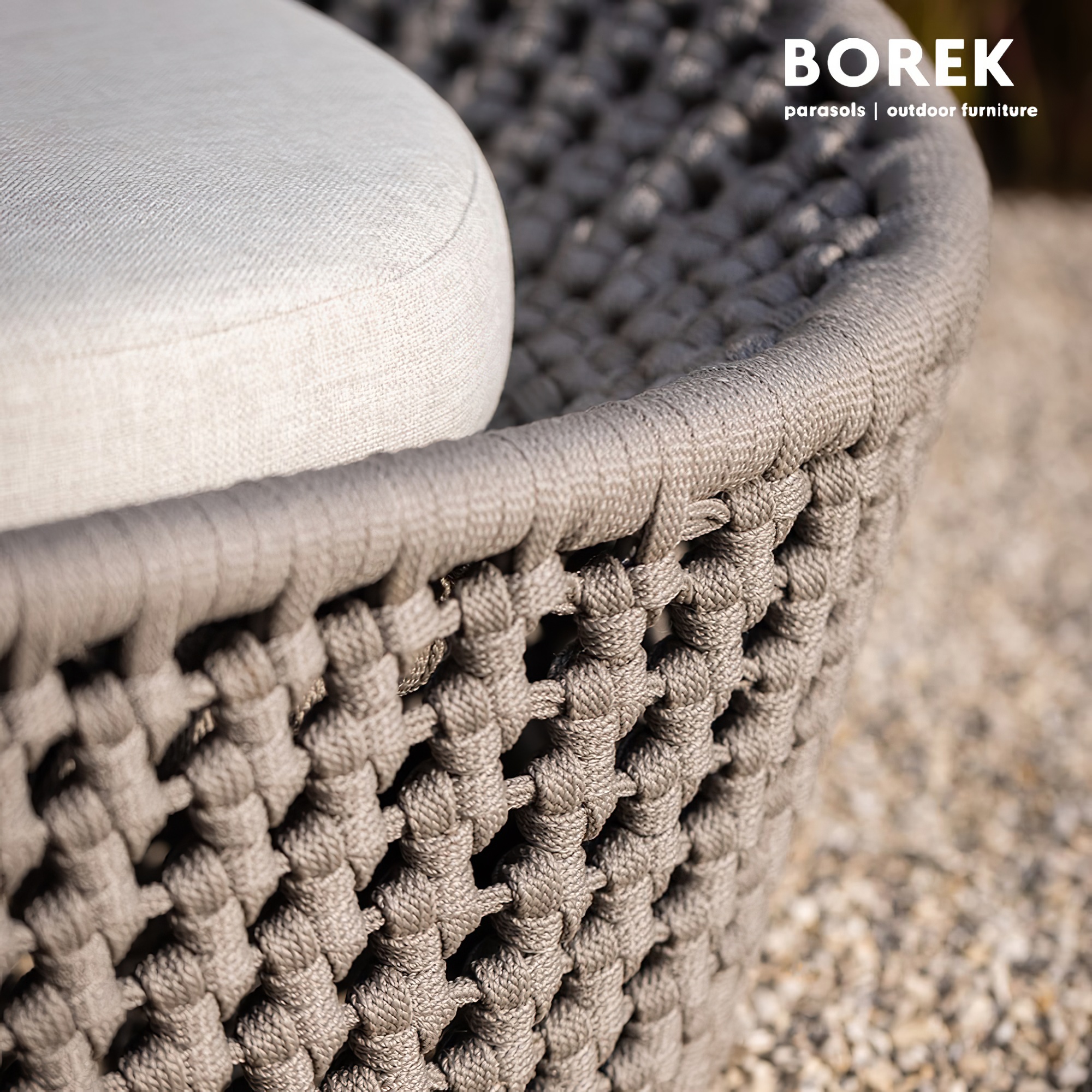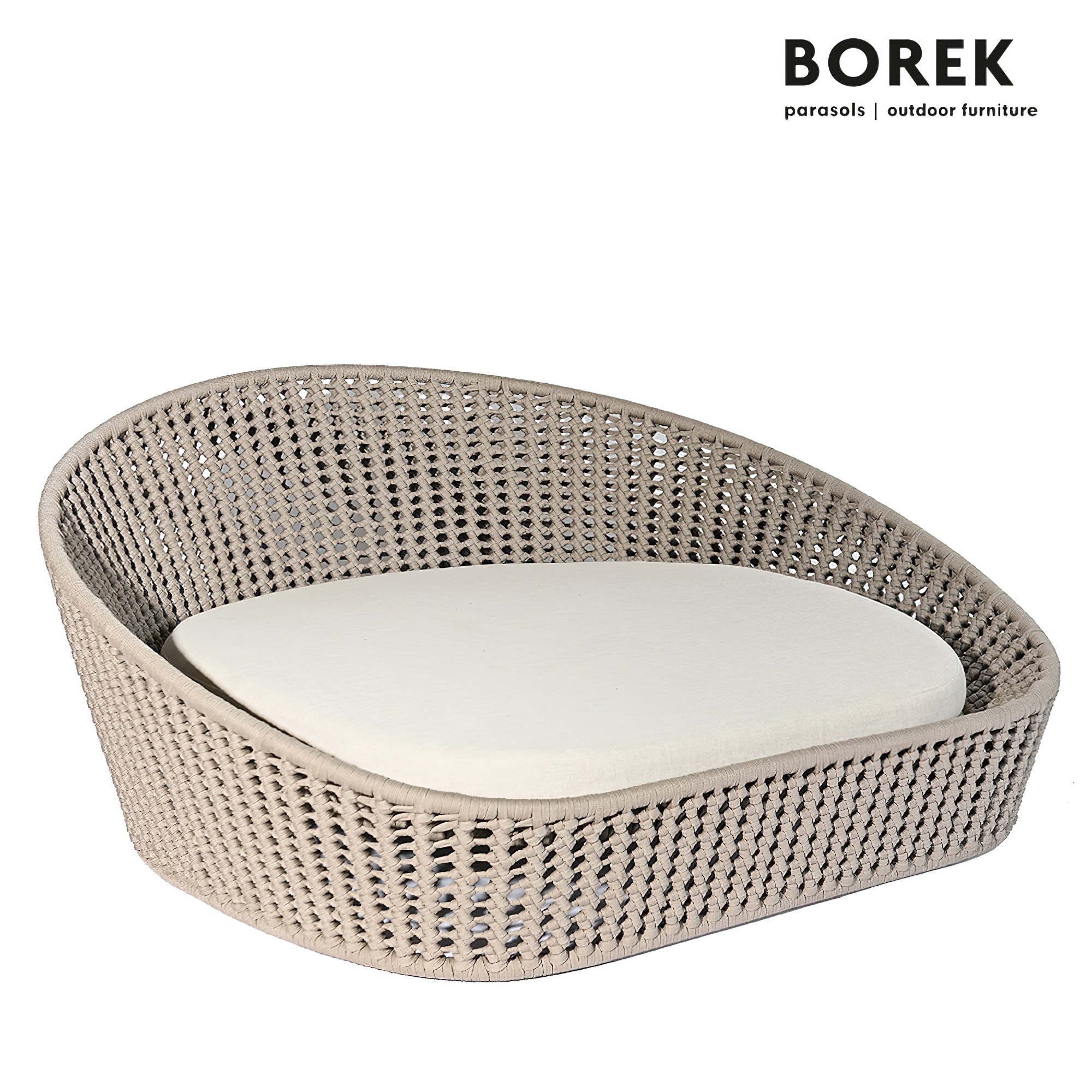 Ce lit de jardin signé Borek séduit par son design moderne, évoquant des moments de détente en fin d'été. Le cadre en aluminium poudré est recouvert d'une toile en corde Ardenza. Cette dernière est déchirure-résistante, résistante aux UV, supporte des températures allant de 40 à 80 degrés et est extrêmement durable face aux intempéries.
