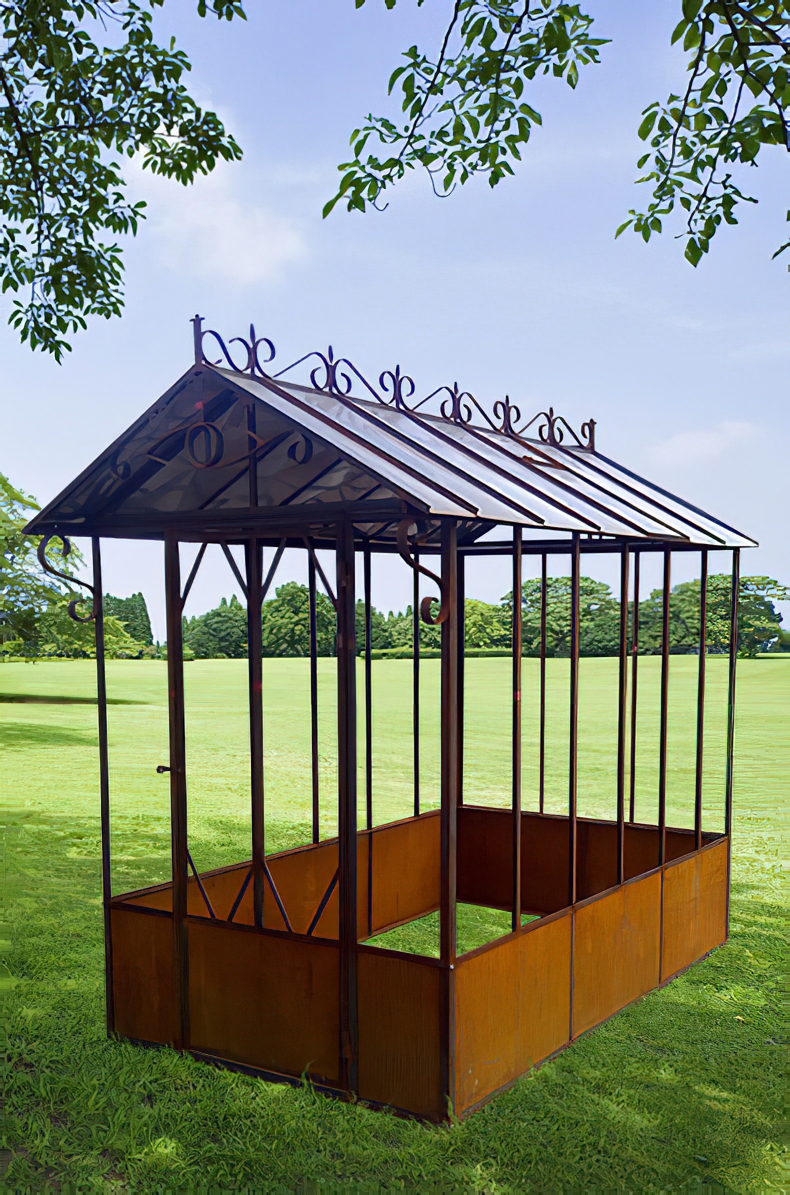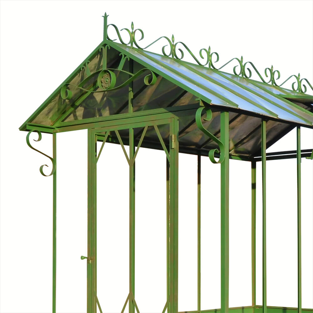 Cette serre unique, fabriquée à la main dans une forge traditionnelle, est réalisée en fer forgé avec des éléments décoratifs en fonte au design ancien. Elle est disponible avec ou sans toit en zinc. Vous pouvez également choisir de commander la serre avec ou sans fenêtres en verre assorties. Le toit est équipé d'une fenêtre basculante pour assurer une bonne ventilation. La palette de couleurs RAL vous offre une liberté totale pour personnaliser la serre selon vos goûts, que ce soit un vert classique ou un rouge éclatant - nous fabriquons la serre selon vos souhaits.