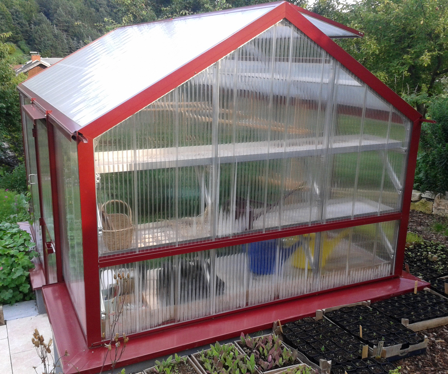 Le gel des parties mobiles est évité grâce à un système de recouvrement et de joints brossés. Les montants sont équipés de rainures en C permettant de tendre des cordes. En raison de leur conception destinée à maintenir l'humidité, nos serres ne conviennent pas comme vérandas.