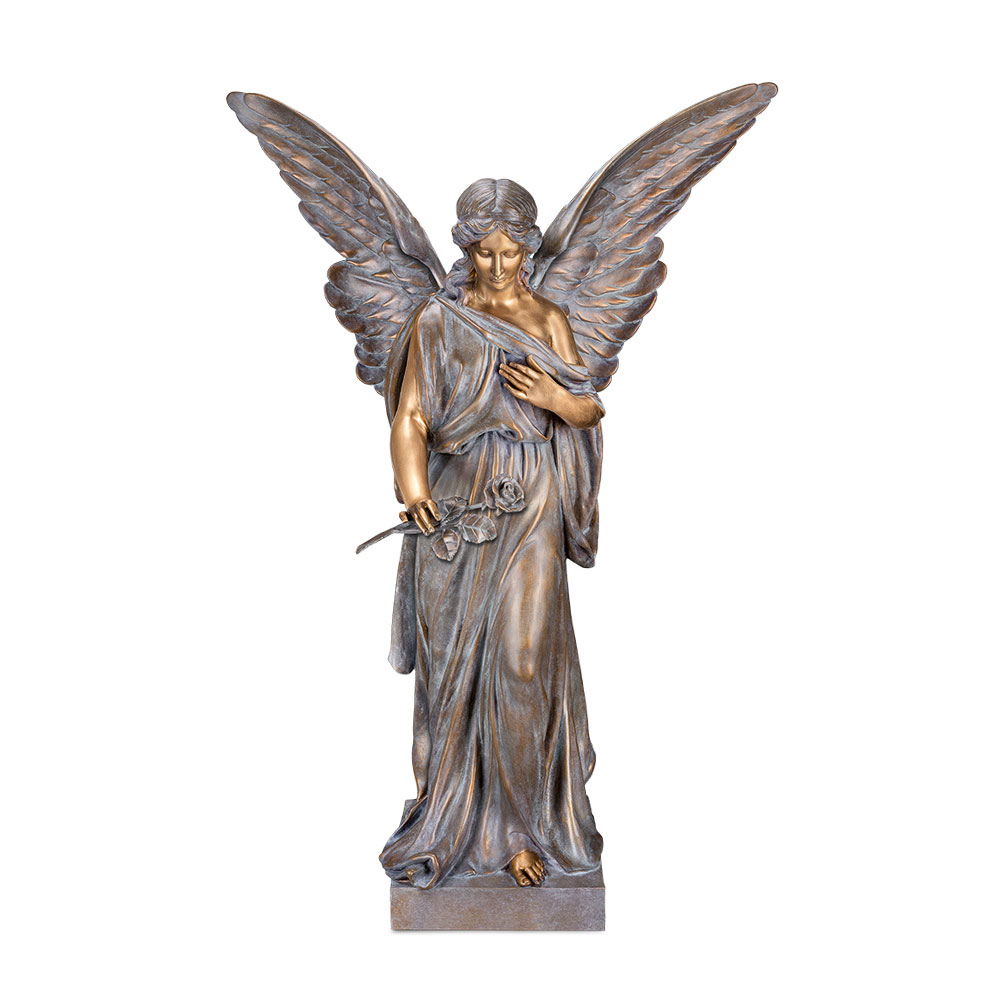Große Bronzeengel Skulptur mit Rose auf Steinguss Sockel - Angelus Florere / Bronze braun