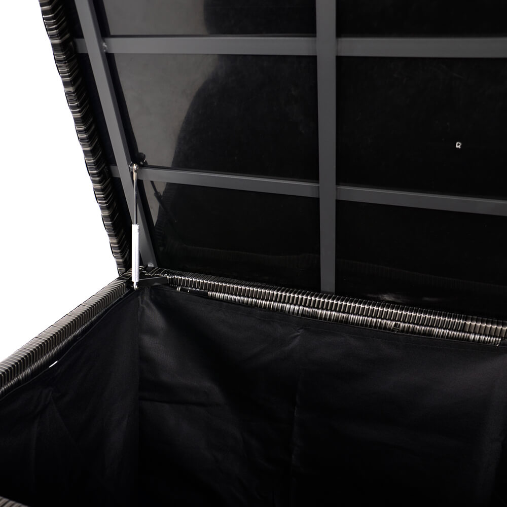 Ce coffre à coussins est fabriqué en aluminium sous un contrôle qualité rigoureux. La structure est recouverte d'un tressage en polyéthylène imitant le rotin. Les brins mesurent 8x2 mm d'épaisseur. Ce meuble d'extérieur est résistant aux intempéries et peut être utilisé toute l'année en extérieur. Pour le nettoyage, un simple chiffon humide suffit. Nous déconseillons l'utilisation de produits nettoyants acides, car ils pourraient endommager la surface et compromettre la résistance aux conditions climatiques.