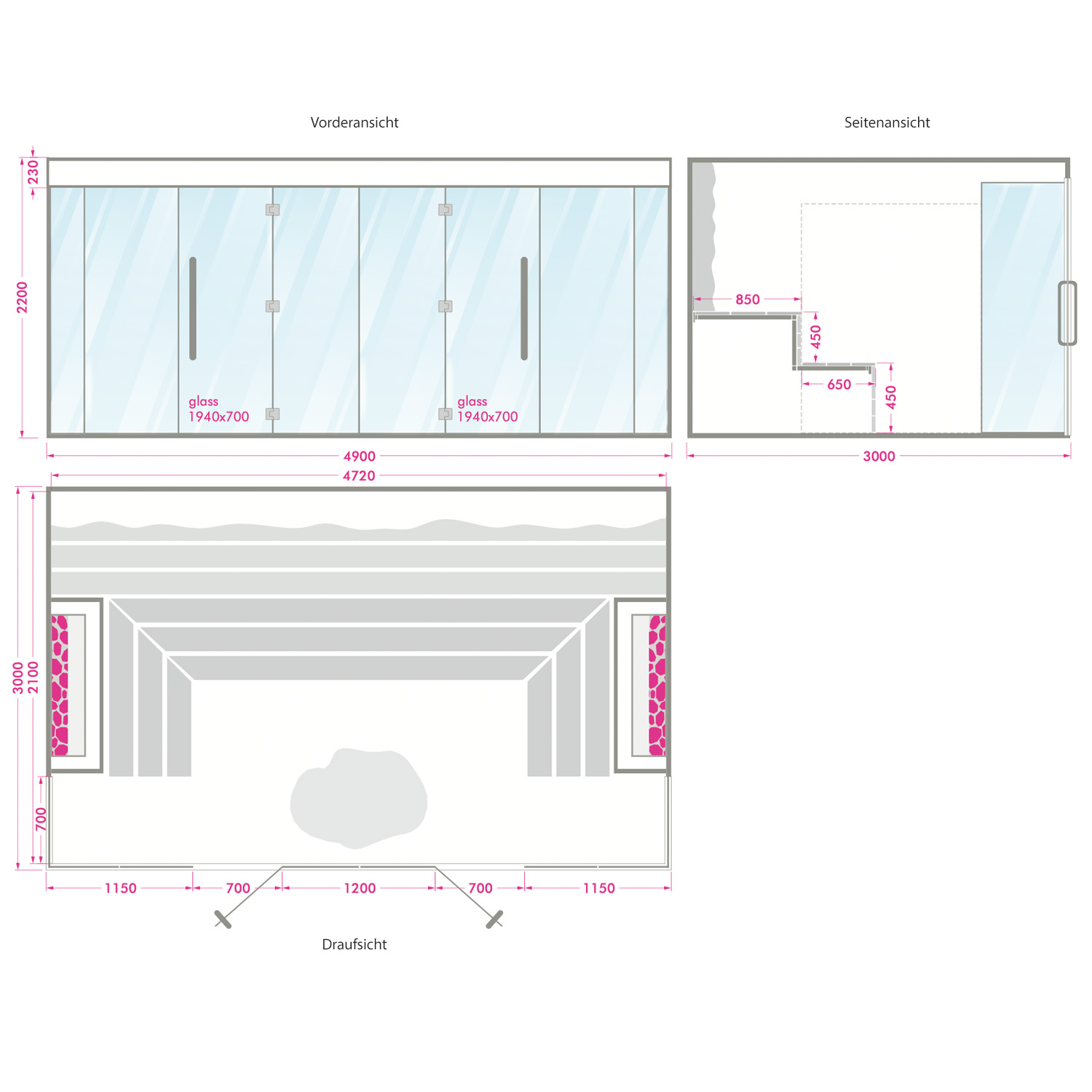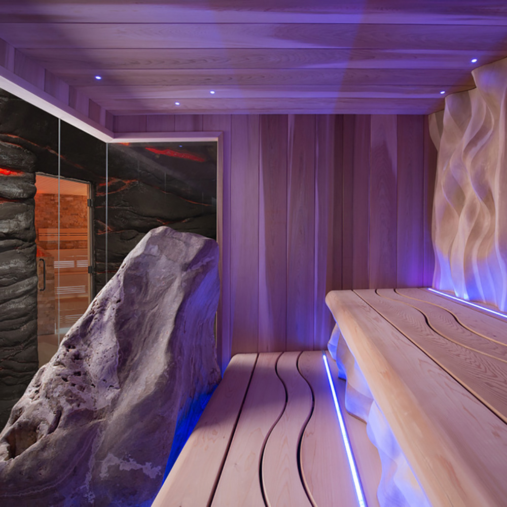 Große Luxus Sauna für den Innenbereich mit 3D Holzwand und Findling für 10-15 Personen - Taria