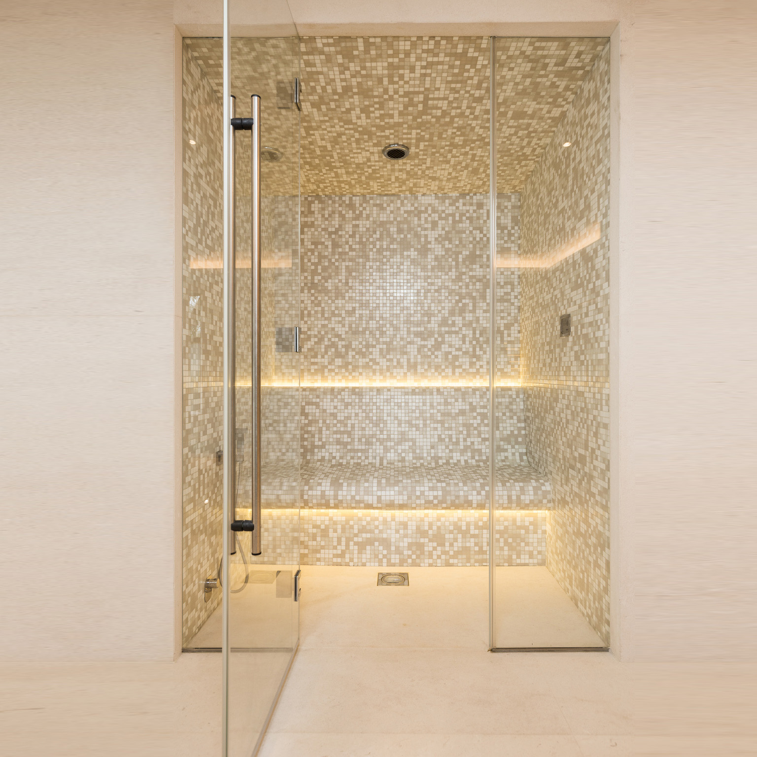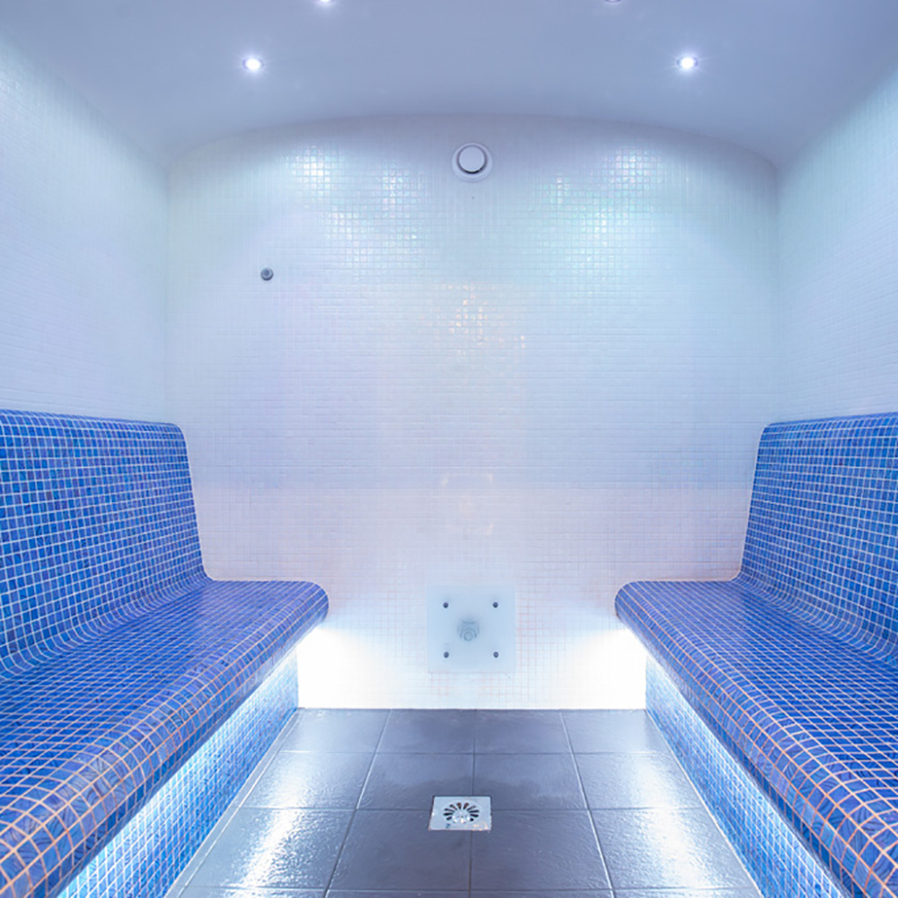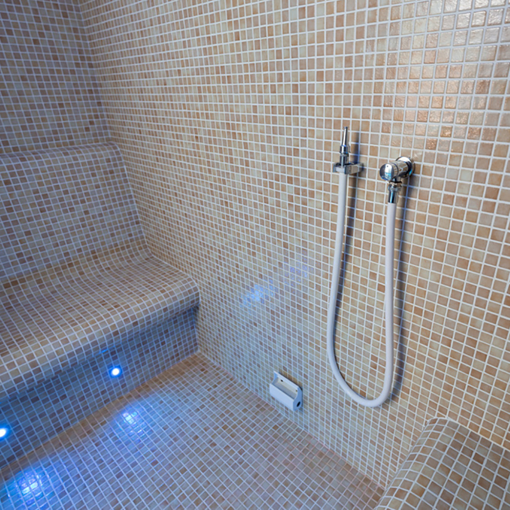 Le bain de vapeur est livré avec un équipement complet. Certains éléments doivent être choisis par vos soins. Des souhaits supplémentaires en matière de design et d'équipement ainsi que des solutions bien-être sur mesure sont possibles. Voici un aperçu de l'équipement standard :