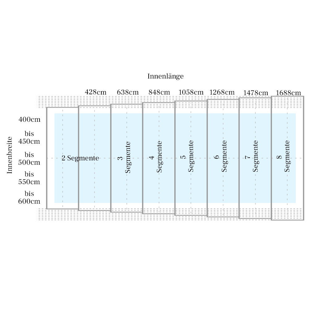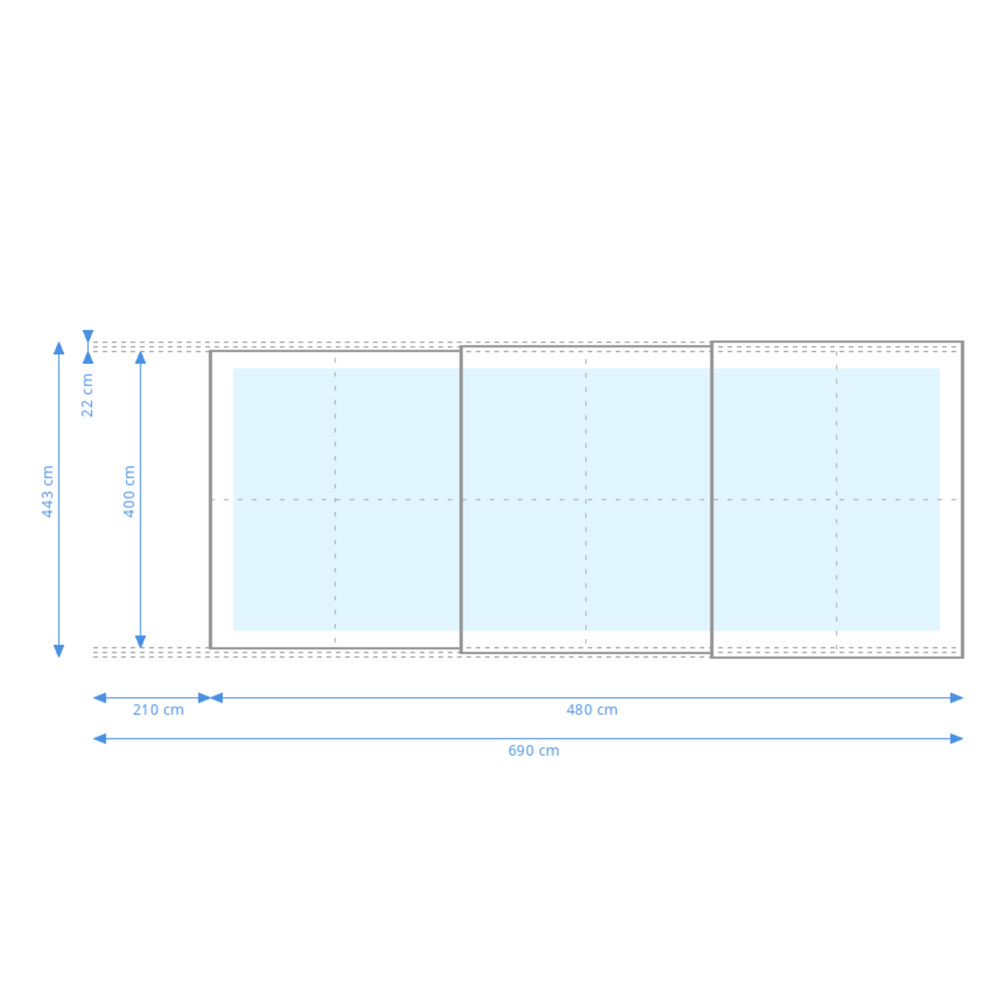 Ce couvercle de piscine haut peut atteindre une hauteur maximale de 265 cm. Les parois frontales avant et arrière sont amovibles. Pour la vitrification, nous utilisons des plaques alvéolaires en polycarbonate. Ces remplissages robustes avec filtre UV double face, reliés aux profils par un mastic silicone, sont disponibles en épaisseur standard de 10 mm (standard ou fumé) ou de 4 mm (transparent clair). Le kit comprend des rails de sol coulissants unilatéraux pour les deux côtés, sans rails d'extension. Voici les principales caractéristiques en un coup d'œil :