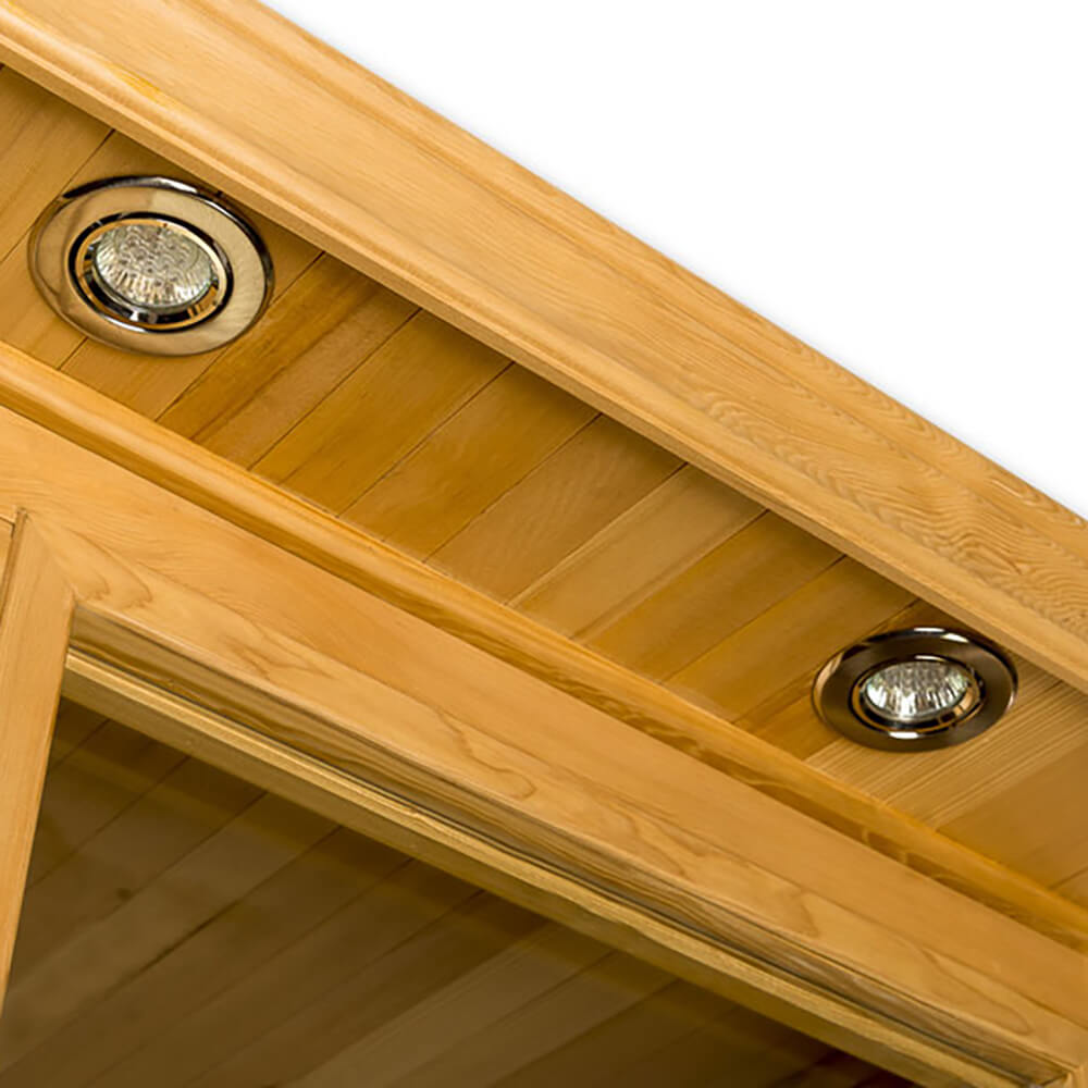 Le bois utilisé est durable, léger et tendre, avec de bonnes propriétés isolantes thermiques et une structure naturellement lisse. Sa teinte naturelle jaune-brun clair crée une ambiance chaleureuse dans le sauna. Le bois de pruche canadienne est particulièrement adapté pour les saunas car il résiste bien à l'humidité et contient peu de résine. Cette dernière caractéristique rend notre sauna idéal également pour les personnes légèrement allergiques au bois.