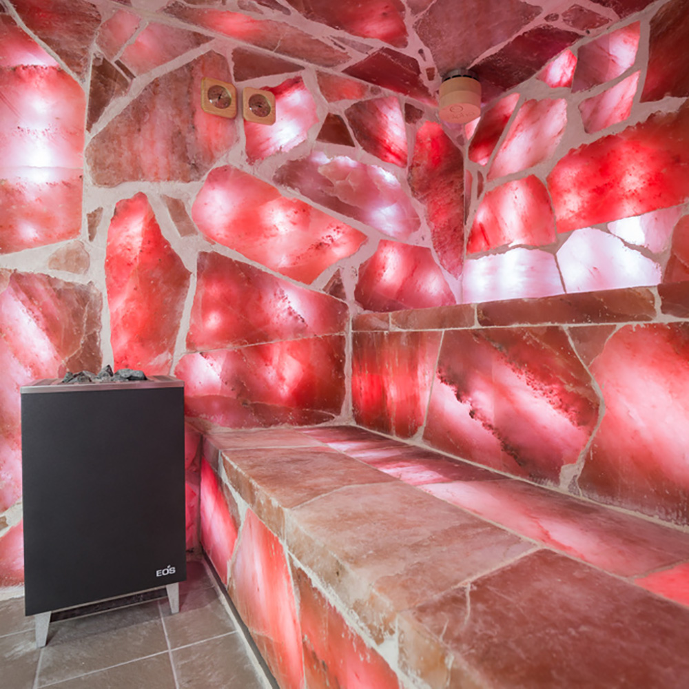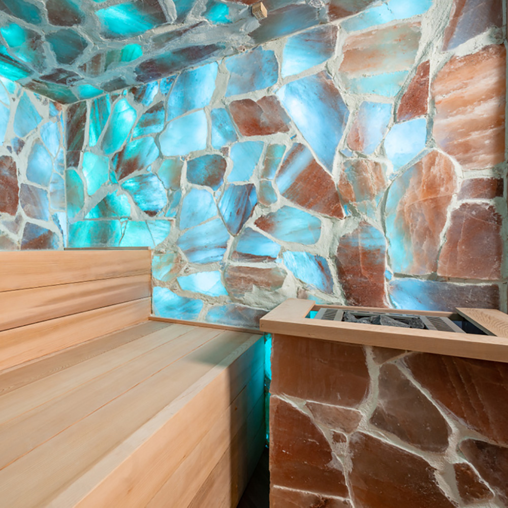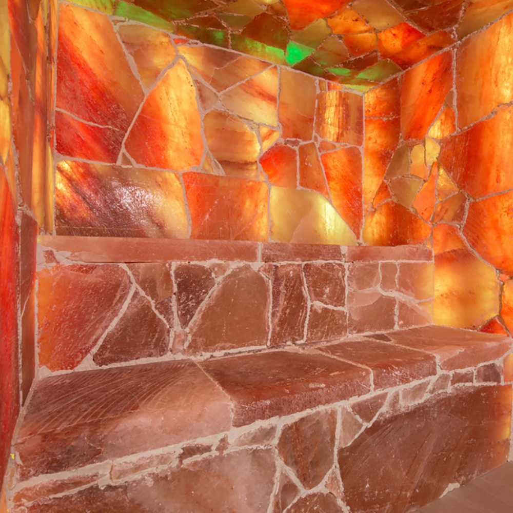 Indoor Salzhöhle mit Mosaikfliesen aus Salzstein inklusive Saunaofen - Majid / ohne Solevernebler