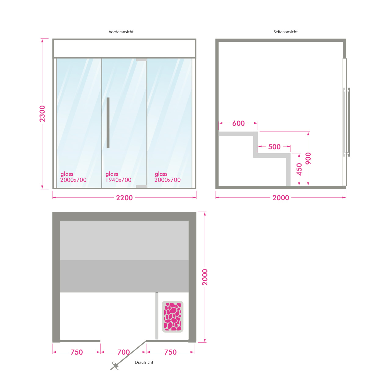 Le sauna est livré avec un équipement complet et soigné. Des souhaits supplémentaires en matière de design et d’équipement ainsi que des solutions bien-être sur mesure sont possibles. Voici un aperçu de l’équipement standard :
