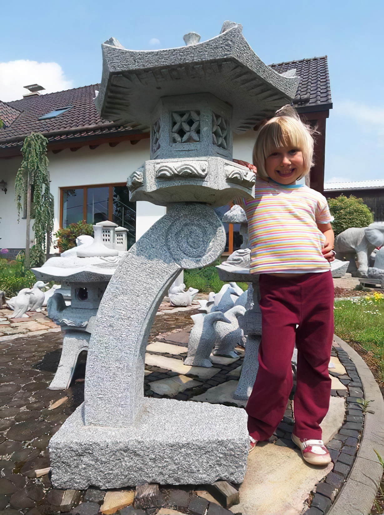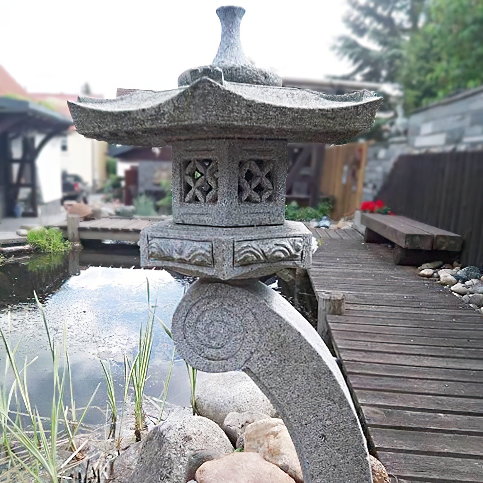 Magnifique lanterne japonaise en pierre naturelle. Cette lampe en pierre a été conçue d'après l'un des modèles les plus célèbres de lanternes japonaises. Chaque lanterne est fabriquée à la main en granit, résistant aux intempéries et au gel. Que ce soit dans un jardin d'inspiration asiatique ou au bord de votre propre étang, cette belle lanterne attirera à coup sûr tous les regards dans votre jardin. Les lanternes en pierre sont disponibles en plusieurs tailles et se composent toujours de six parties. Il est recommandé d'assembler solidement les éléments à l'aide d'un adhésif adapté pour pierre. Veillez également à ce que la base soit suffisamment stable afin que la lanterne ne bascule ni ne tombe.