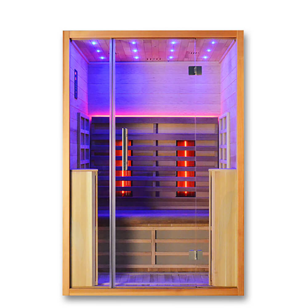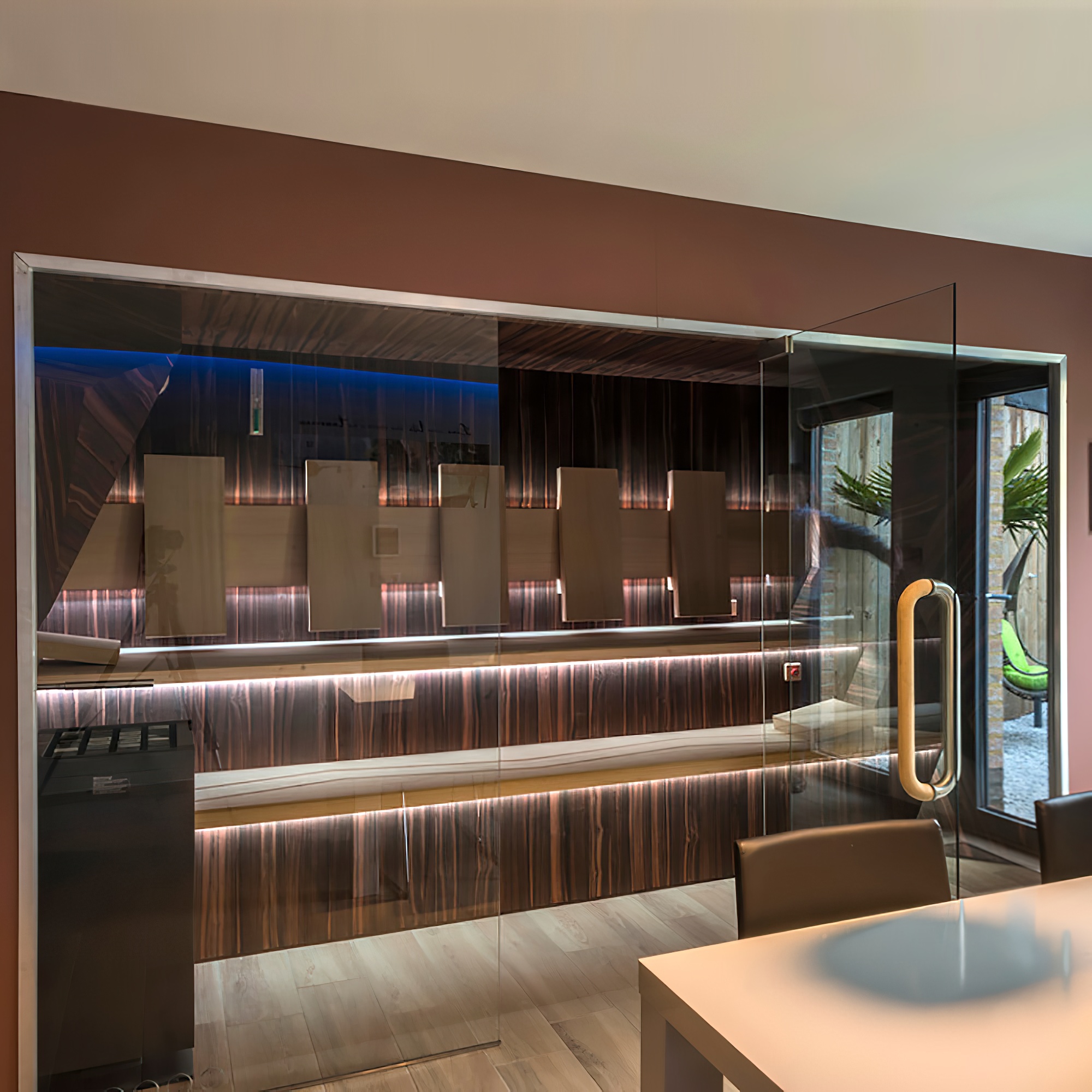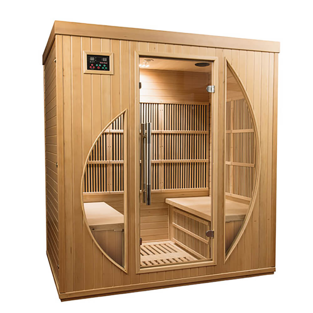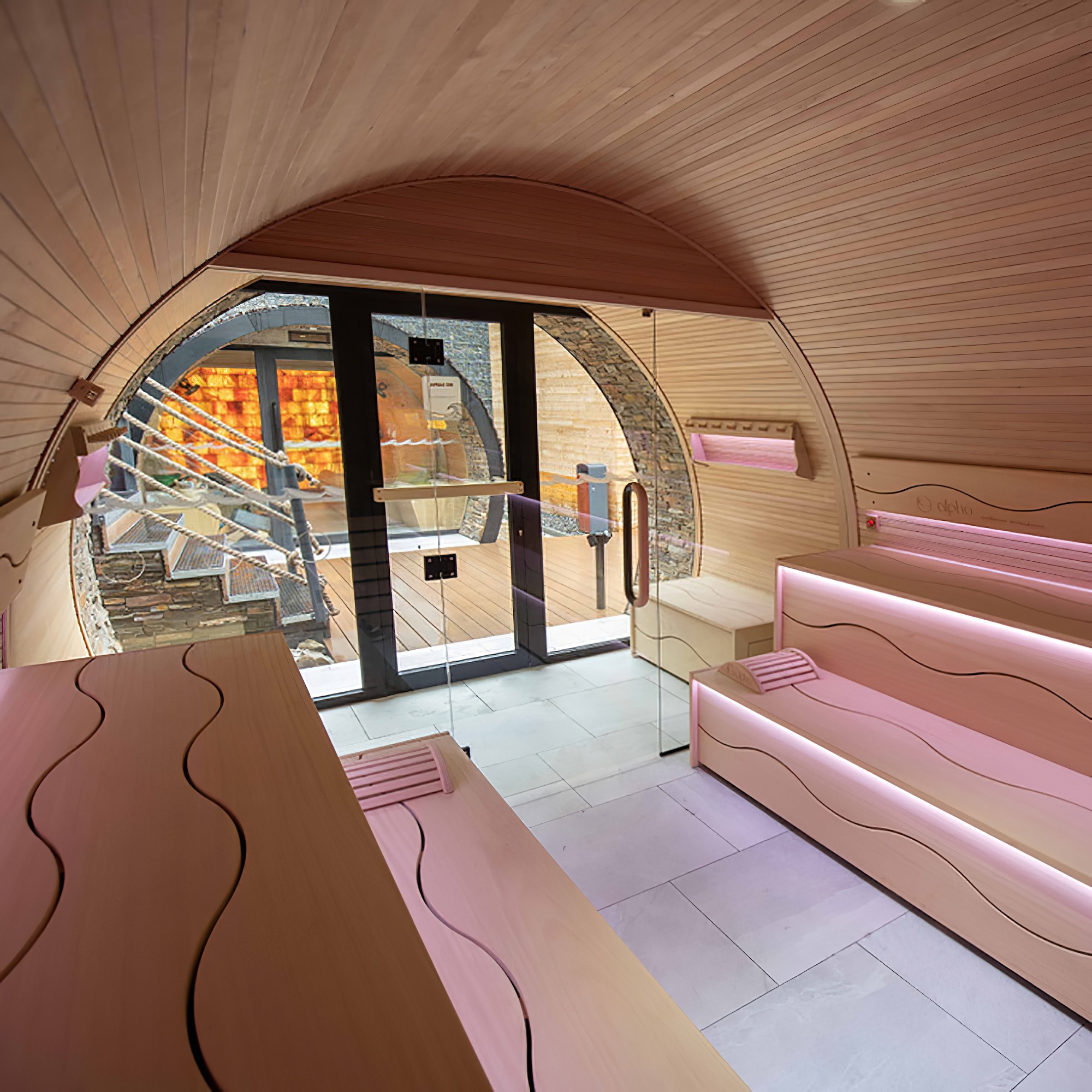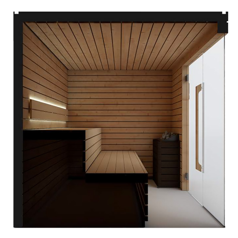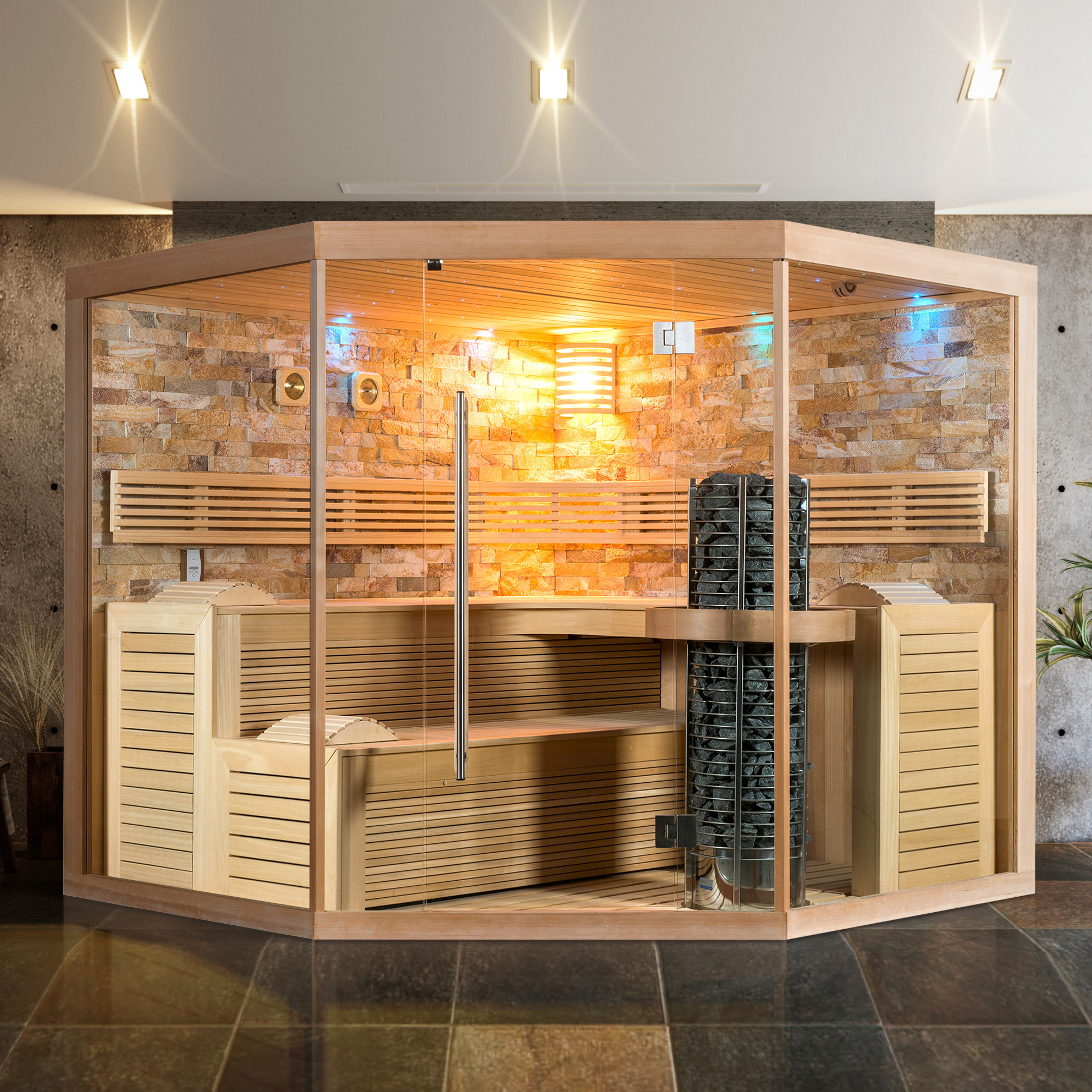 Große Premium Heimsauna mit Natursteinwand, Holzmobiliar und Glasfront - Osiria / 200x250x200cm (HxBxT) / Finnische Sauna