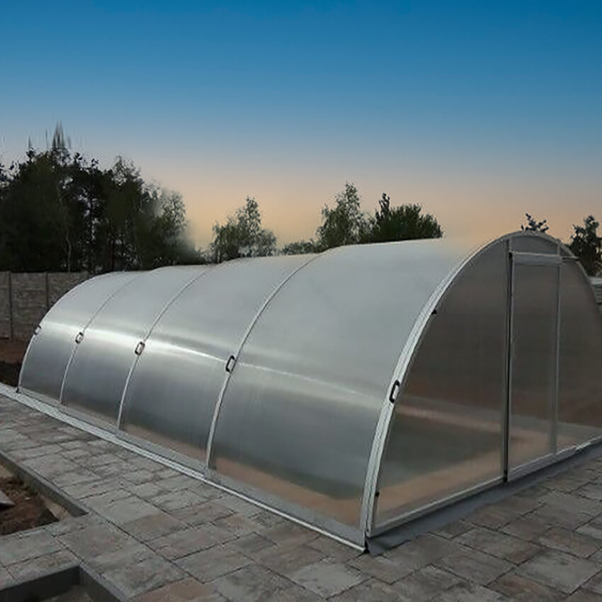 Ce modèle présente un toit incurvé avec une hauteur standard maximale de 300 cm. Les parois frontales avant et arrière sont amovibles. Pour la vitrification, nous utilisons des plaques alvéolaires en polycarbonate. Ces remplissages robustes avec filtre UV double face, reliés aux profils par un mastic silicone, sont disponibles en épaisseur standard de 10 mm (standard ou fumé) ou de 4 mm (transparent clair). Le kit comprend des rails de sol coulissants unilatéraux pour les deux côtés, sans rails d'extension. Veuillez noter qu'à partir d'une profondeur de 600 cm et pour la version transparente des remplissages en polycarbonate, la porte est uniquement disponible avec seuil coulissant. Voici les principales caractéristiques en un coup d'œil :