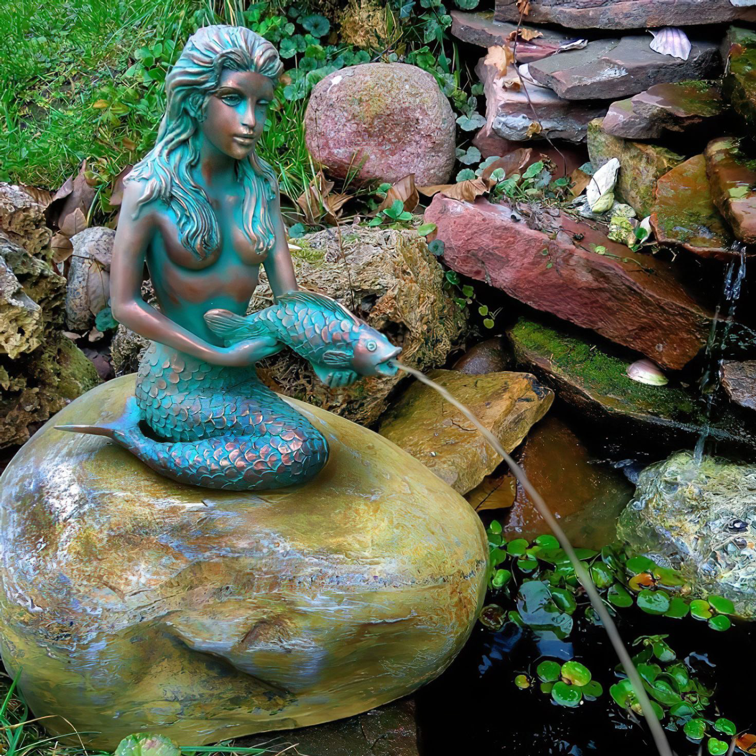 Meerjungfrau mit Fisch - Kunstvoller Steinguss Wasserspeier für den Teich - Nektaria / Olimpia