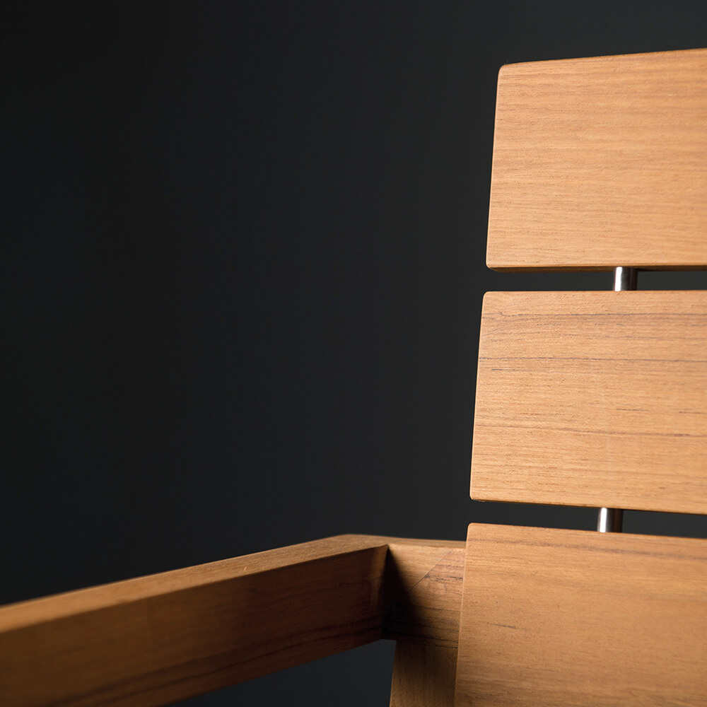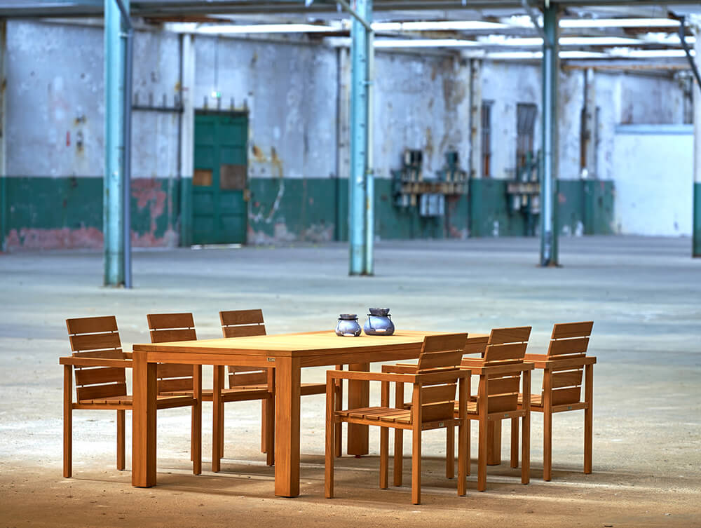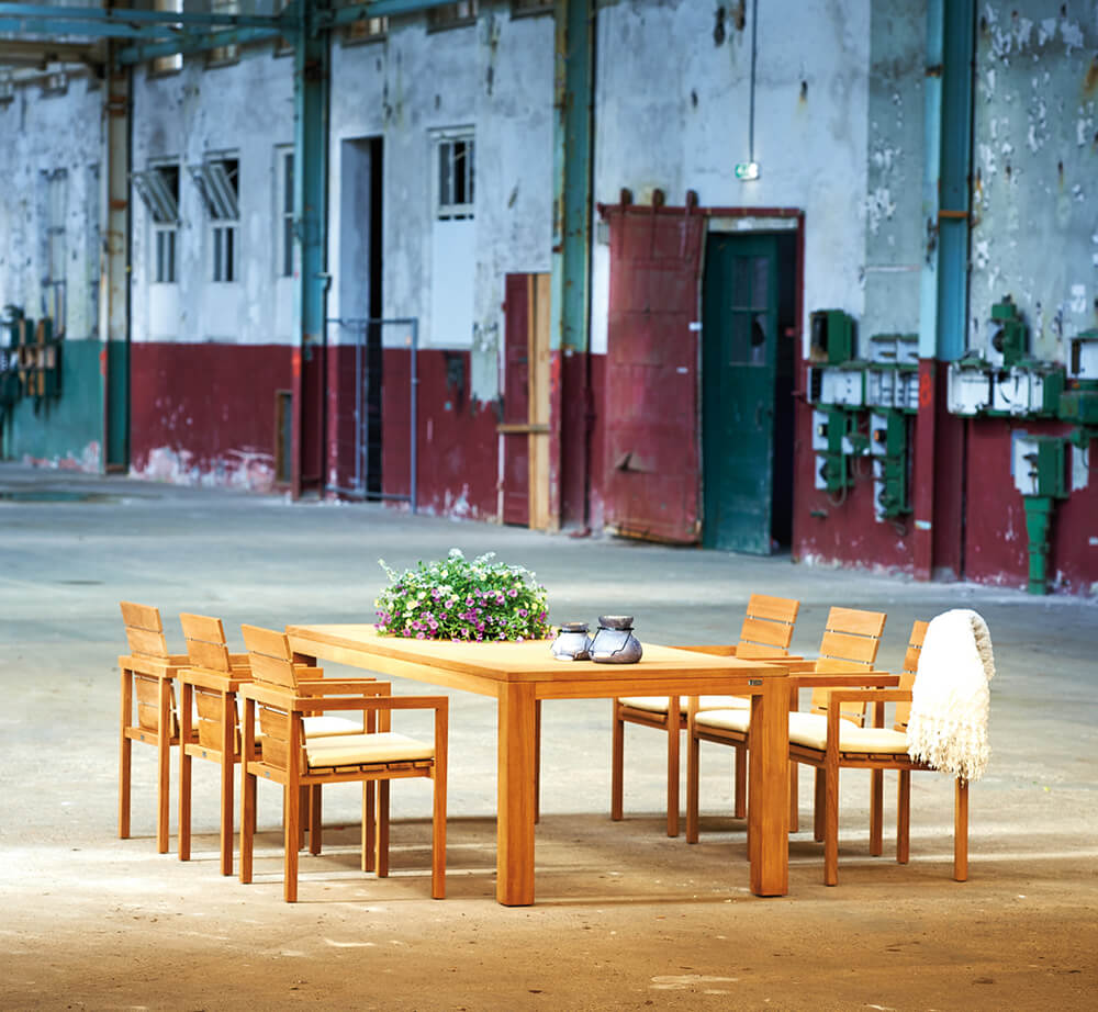 Le teck est un bois dur tropical avec une teinte chaude miel-brun. Avec le temps, sous l'effet du vent et des intempéries, le bois développe une patine argentée attrayante. Les amateurs de la teinte chaude du bois peuvent ralentir ce processus de patinage et conserver le teck en utilisant notre Teak Sealer. Ce traitement doit être appliqué avant la première utilisation du mobilier. La fine lasure empêche l'oxydation interne du bois en repoussant l'eau. Si vous préférez la couleur gris argenté, traitez le bois avec TEAK CLEANER après qu'il ait grisé. Veuillez ne jamais utiliser de nettoyeur haute pression pour nettoyer vos meubles de jardin.