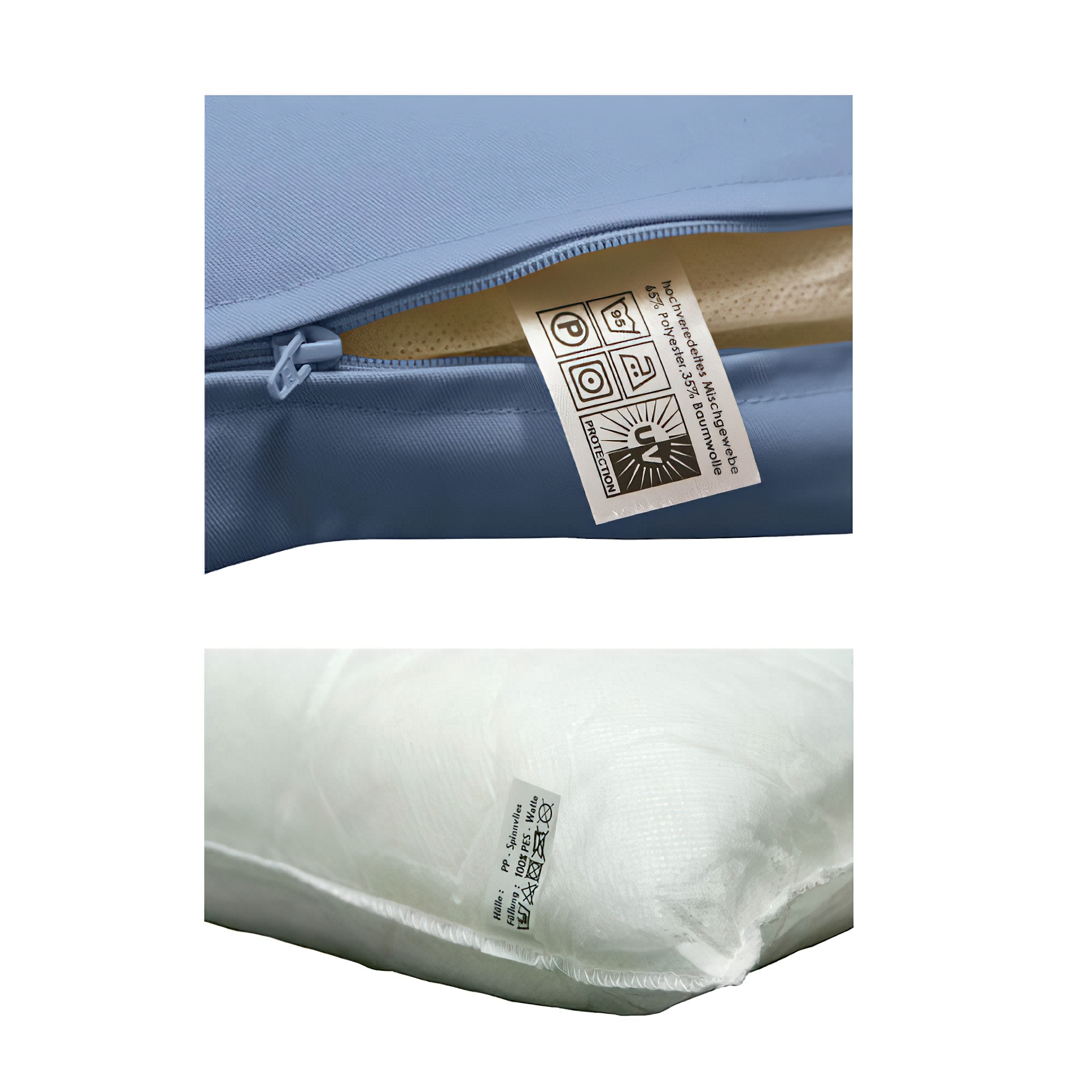 Grâce à la combinaison de fibres de polyester et de coton, ces coussins tolèrent bien l'humidité, la saleté et les rayons UV. Les housses peuvent être lavées confortablement en machine. Grâce à la présence de polyester, elles sèchent rapidement et sont prêtes à être réutilisées en peu de temps. Le rembourrage en mousse doit être lavé à la main uniquement, afin d'éviter l'agglutination de la mousse et d'endommager le non-tissé.
