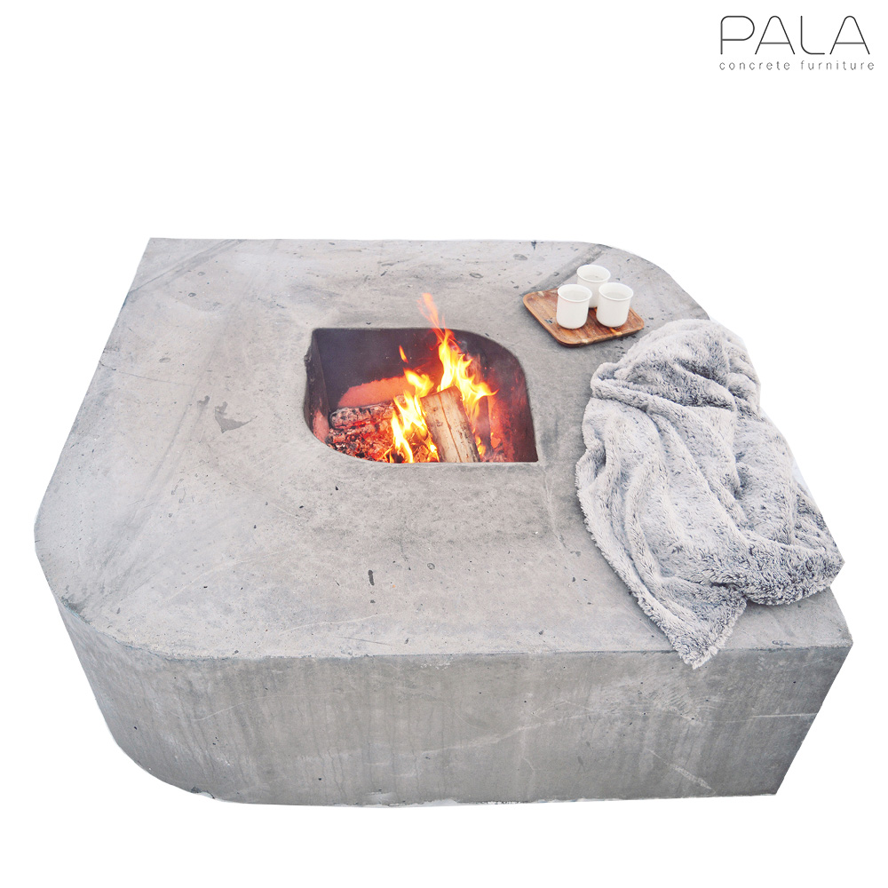 Outdoor Loungeecke mit Sofas, Feuerstelle und Pflanzkübeln aus Beton - Evelina