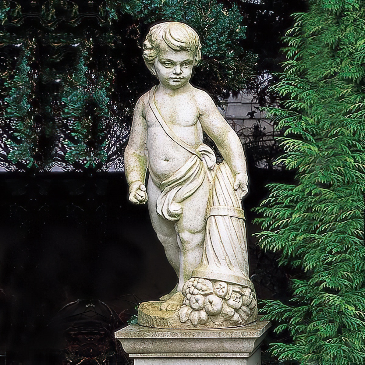 Ce travail d'exception fait partie de notre petite collection de putti élégants pour le jardin, où les quatre éléments Terre, Feu, Air et Eau sont artistiquement incarnés. Ces putti en pierre sont des répliques fidèles des sculptures artisanales créées vers le XVIIIe siècle à Norfolk et exposées dans le célèbre domaine d'Elveden Hall. La statue en pierre reconstituée s'inspire stylistiquement de la représentation baroque du putto. Chaque détail de l'enfant est finement sculpté. Le garçon est vêtu uniquement d'un simple tissu et d'une ceinture. Le panier rempli de fruits des champs et du jardin symbolise ici l'élément Terre. En tant qu'objet décoratif, le putto de jardin gagne en charme naturel grâce à la patine qui se forme avec le temps. Disponible dans des teintes uniques telles que sable, gris pierre, blanc et terre cuite, cette jolie statue s'intègre parfaitement dans un aménagement de jardin existant.