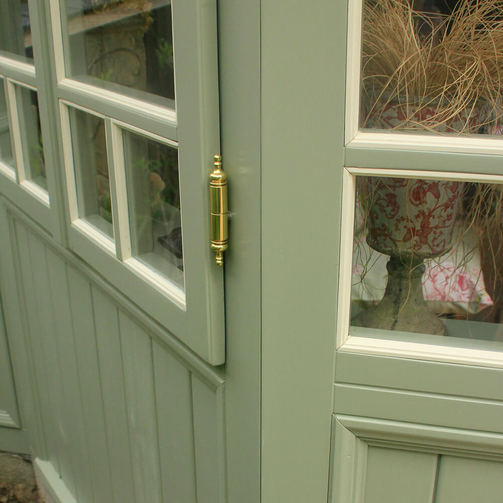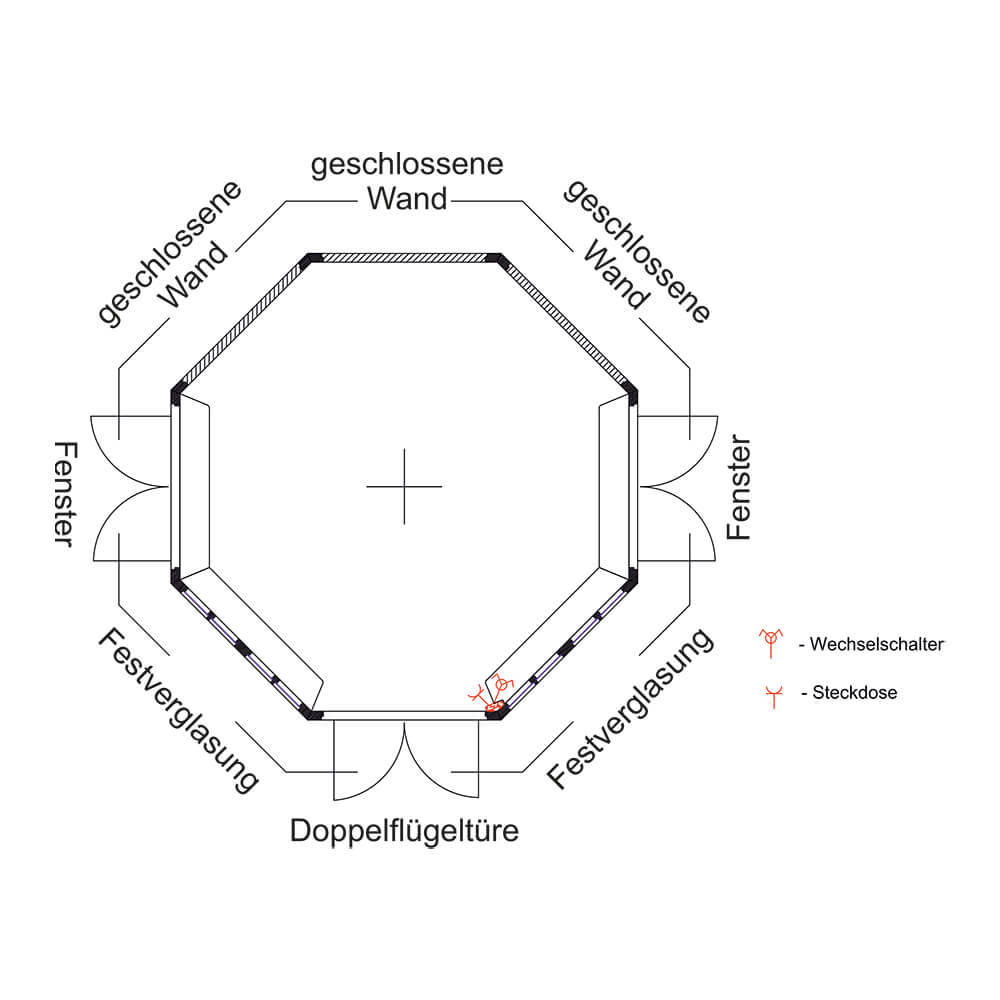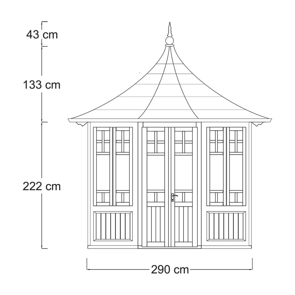 Nos magnifiques pavillons en bois sont fabriqués avec des matériaux durables selon la tradition artisanale du bois. Des détails raffinés, tels que des croisillons divisant les vitres, confèrent aux pavillons un caractère unique, idéal pour un style maison de campagne, mais aussi comme un élément élégant dans les jardins modernes. Le bois dur utilisé pour toutes les parties en contact avec le sol ainsi que pour le plancher est extrêmement robuste et classé dans la catégorie de durabilité 1-2 selon la norme DIN-EN 350, garantissant une haute résistance aux insectes et aux champignons. Le plancher est composé de lames de 27 mm d'épaisseur (8 éléments de sol) avec ventilation arrière. Un revêtement multiple à base d'acrylique microporeux et respirant à base d'eau assure une protection durable contre les intempéries et donne aux éléments de construction, fenêtres et portes en bois résineux, un aspect satin mat. Les pentes, gouttières et bords goutte-à-goutte permettent à l'eau de pluie de s'écouler et protègent le pavillon de l'humidité stagnante. Le toit en pagode pointue avec large débord est réalisé en tôles galvanisées ou en cuivre. Une finition forgée à la main avec boule et lance orne le sommet du pavillon. Les vitrages des fenêtres de style Art nouveau sont en verre véritable de 4 mm avec croisillons et baguettes de fenêtre contrastées. Les appuis de fenêtre (17 cm de profondeur) offrent un espace pour fleurs et éléments décoratifs. Les deux vantaux de porte ainsi que les fenêtres à double battant s'ouvrent vers l'extérieur. Des crochets anti-tempête et des barres de maintien nordiques en laiton chromé garantissent une utilisation sûre par tous les temps. Le vantail gauche est équipé de verrous, le droit d'une fermeture multipoints avec serrure à cylindre et poignée chromée. Une installation électrique avec interrupteur, câblage pour l'éclairage intérieur ainsi qu'une prise de courant font également partie de l'équipement standard du pavillon.