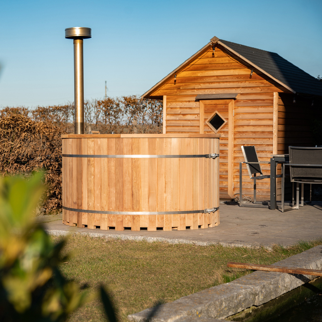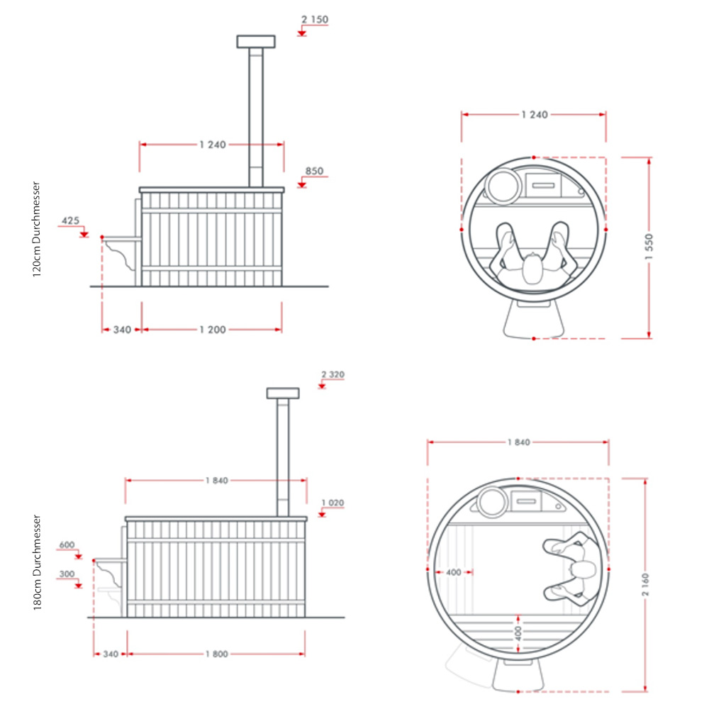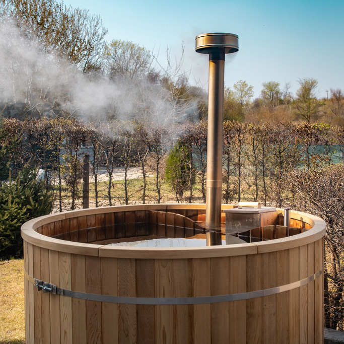 Runder Outdoor Saunabottich aus Abachi Holz inklusive Holzofen - Oseye / ohne Abdeckung / 180cm