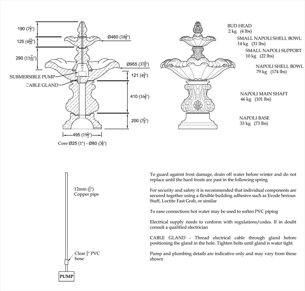 La fontaine fonctionne avec un circuit d'eau fermé comprenant une pompe et un réservoir, vous n'avez donc besoin que d'une alimentation électrique et d'eau pour la mettre en marche. L'eau jaillit de la sculpture en pierre vers la vasque supérieure, cascade en jolis filets dans la grande coquille, puis est pompée vers le haut via le réservoir intérieur.