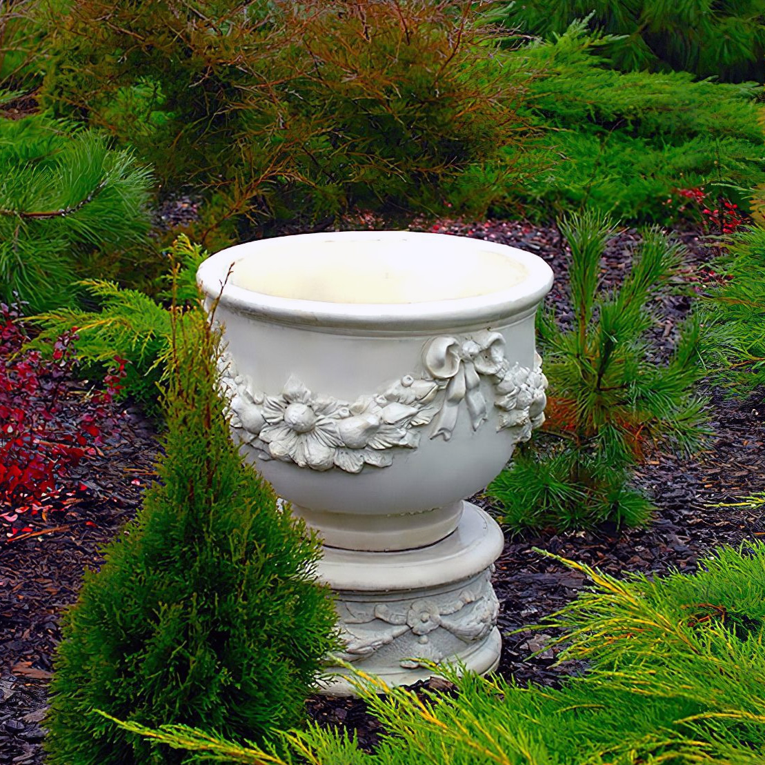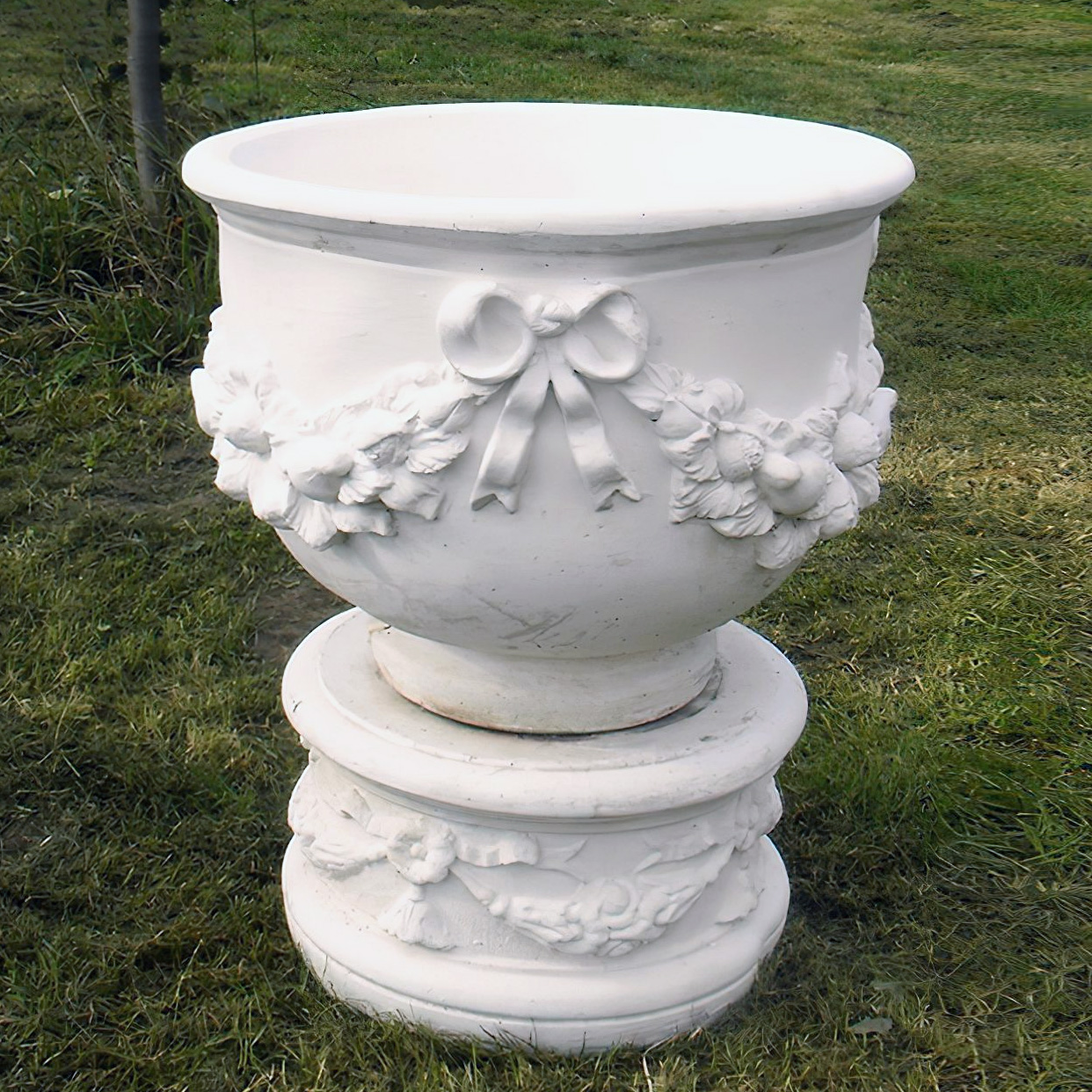 Stilvoller Steinguss Pflanztopf mit Schleifen und floralen Mustern - rund - Galatea / Etna / ohne Sockel