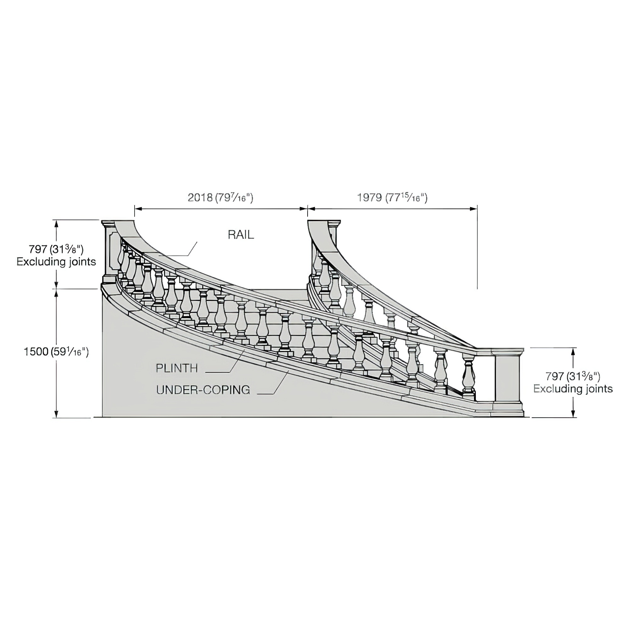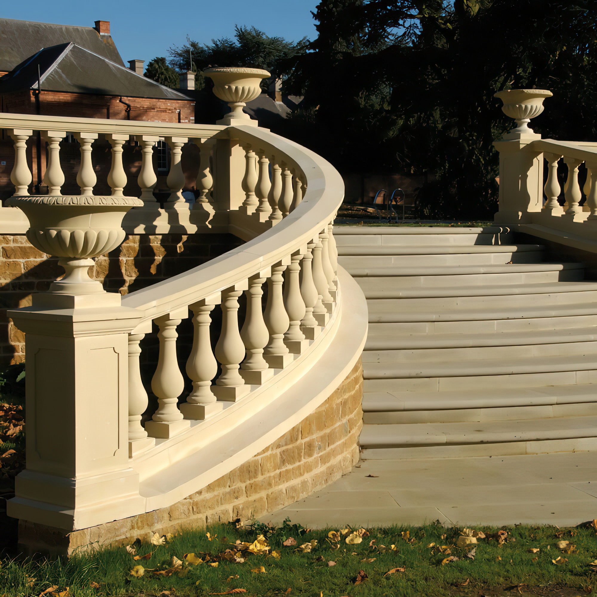 Cette balustrade présentée, comprenant main courante, balustres et socle, est fabriquée selon un procédé de moulage spécial utilisant du sable, du ciment blanc et des pigments d'oxyde de fer. Grâce au traitement à l'humidité contrôlée des matériaux sable et ciment, la texture de surface est adaptée à celle de la pierre naturelle. Nous proposons trois couleurs de base au choix : sable, blanc et terre cuite. Les différents éléments du système de balustrade peuvent ensuite être simplement assemblés sur place à l'aide de colle à ciment et de chevilles en acier inoxydable.