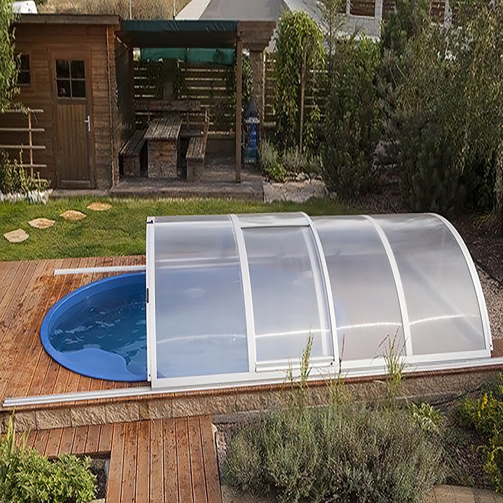 Questa copertura per piscina, con un'altezza di 103 cm, una larghezza di 460 cm e una profondità di 320 cm (dimensioni interne), è ideale per piscine compatte. Presenta un tetto arcuato standard e una porta laterale nel segmento anteriore. Le pareti frontali e posteriori sono rimovibili. I profili portanti in alluminio anodizzato di colore argento garantiscono una grande resistenza all'usura. Per la vetratura utilizziamo pannelli alveolari in policarbonato, spessi 10 mm, dotati di filtro UV su entrambi i lati e sigillati ai profili con silicone. Questi pannelli sono estremamente robusti e in grado di assorbire piccoli carichi. Nel pacchetto sono incluse guide per pavimento scorrevoli e pedonabili su entrambi i lati, oltre a prolunghe da 210 cm. Su richiesta, è possibile scegliere su quale lato installare la porta scorrevole. Offriamo inoltre serrature adatte per le porte.
