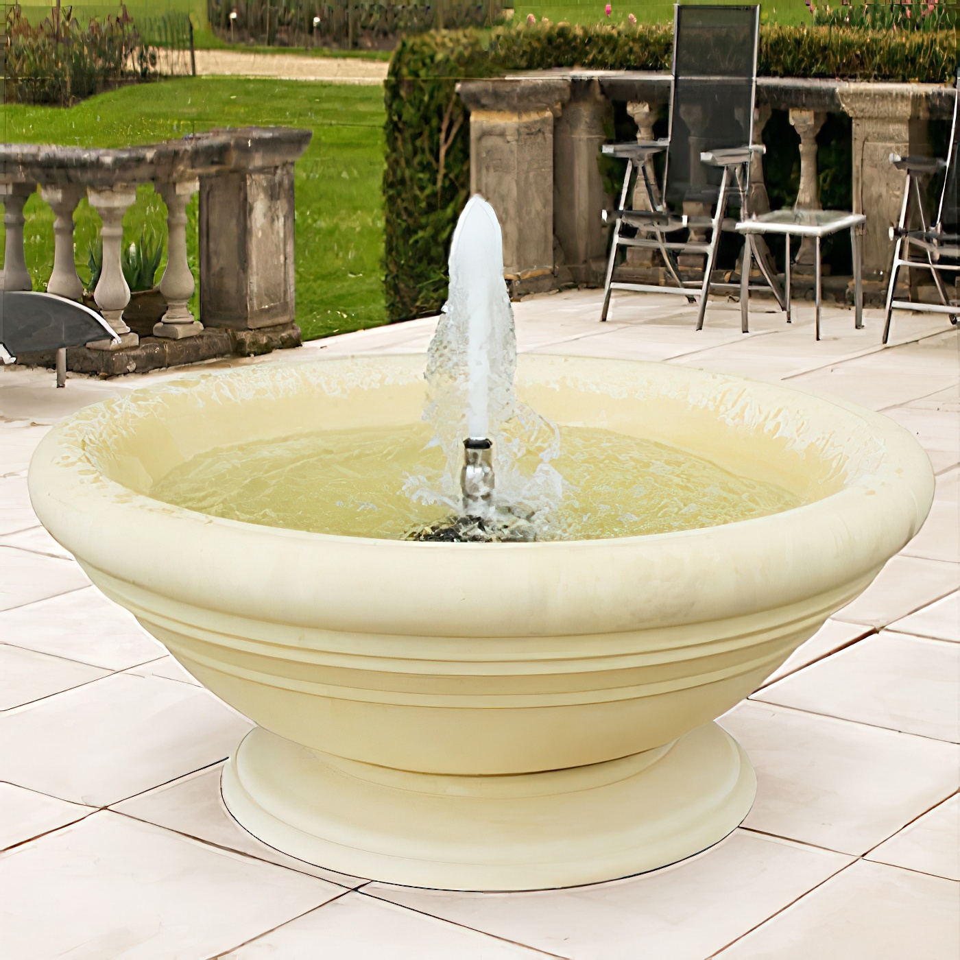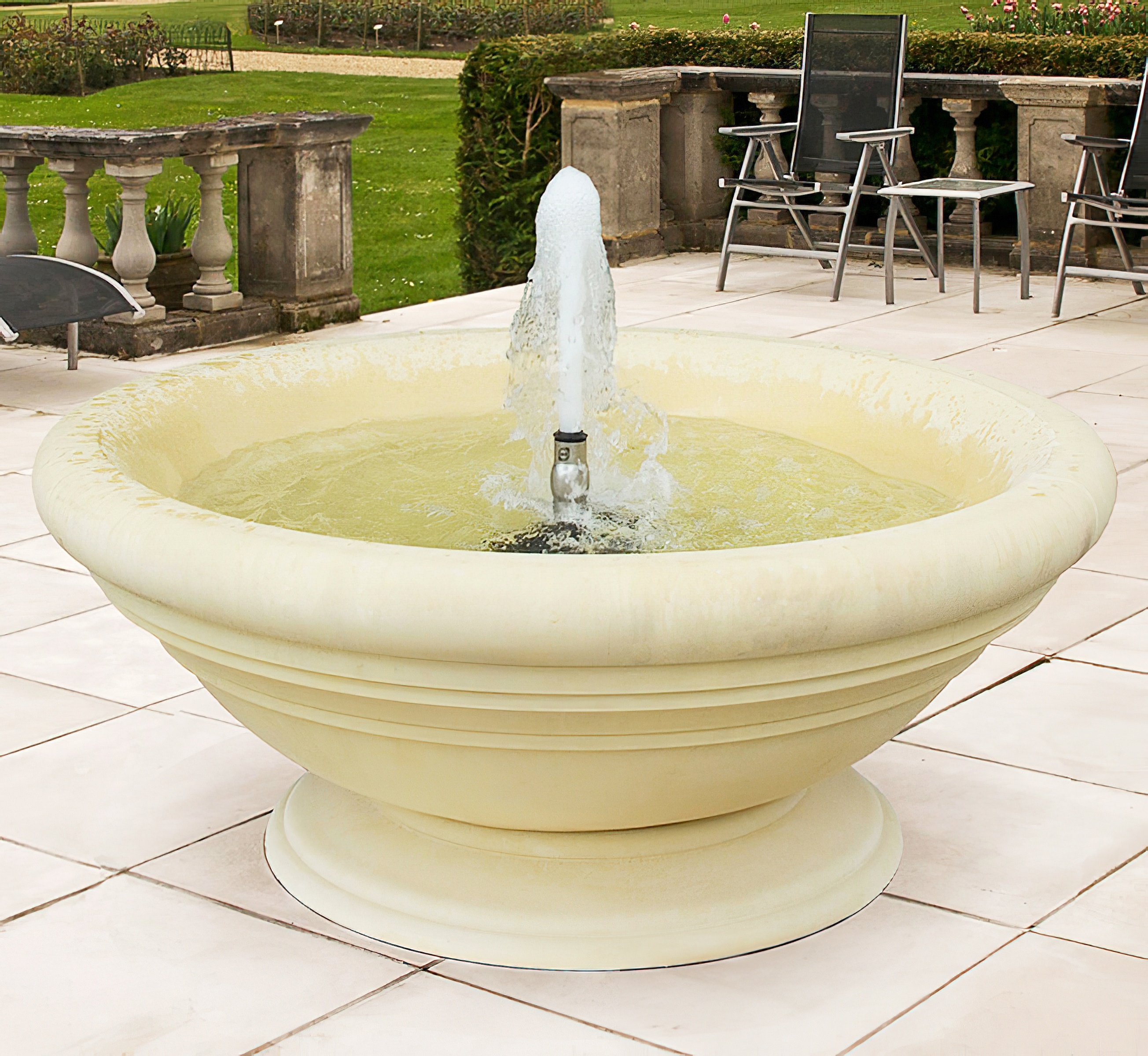 La fontana viene consegnata pronta all'uso come sistema a circuito chiuso, completa di pompa e componenti di collegamento per un'installazione semplice e immediata. La pompa è posizionata al centro, nel punto più basso della fontana, ed è una piccola pompa sommersa da 11KW con filtro grossolano integrato. Il cavo elettrico esce nuovamente dalla parte inferiore alla base della fontana. Durante l'inverno è consigliabile svuotare completamente la fontana e coprirla con una protezione contro pioggia e neve. La pompa può essere facilmente rimossa e sostituita manualmente per manutenzione. Il materiale è completamente resistente al gelo e alle intemperie, adatto per rimanere all'aperto tutto l'anno. Tuttavia, durante il periodo di gelo si consiglia di evitare ristagni d'acqua nella fontana svuotandola.